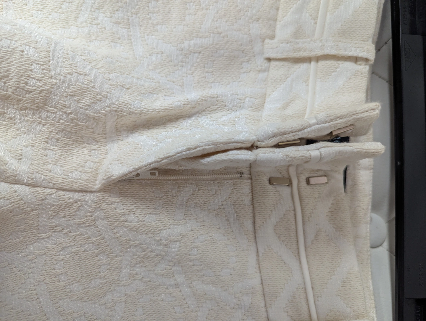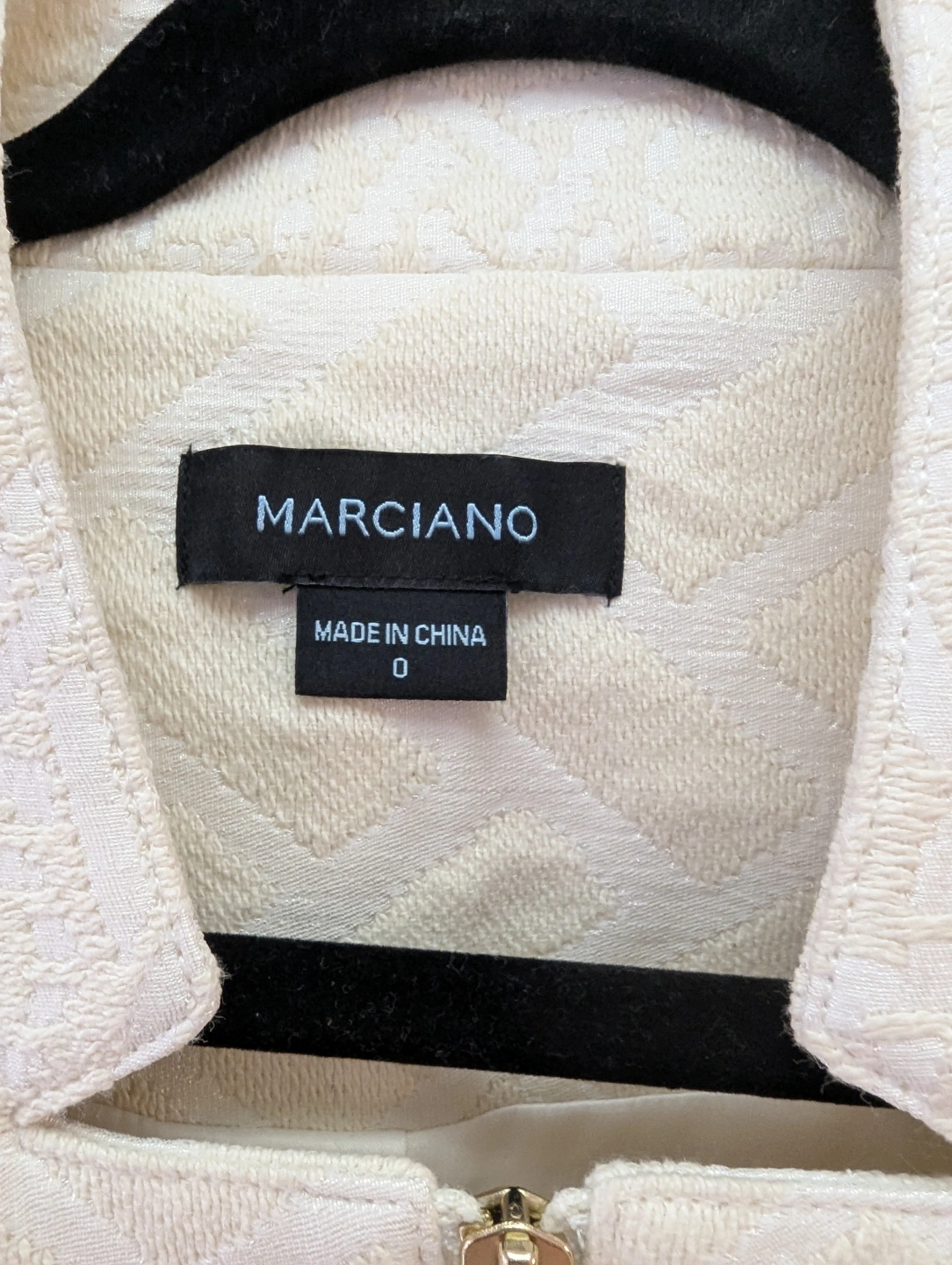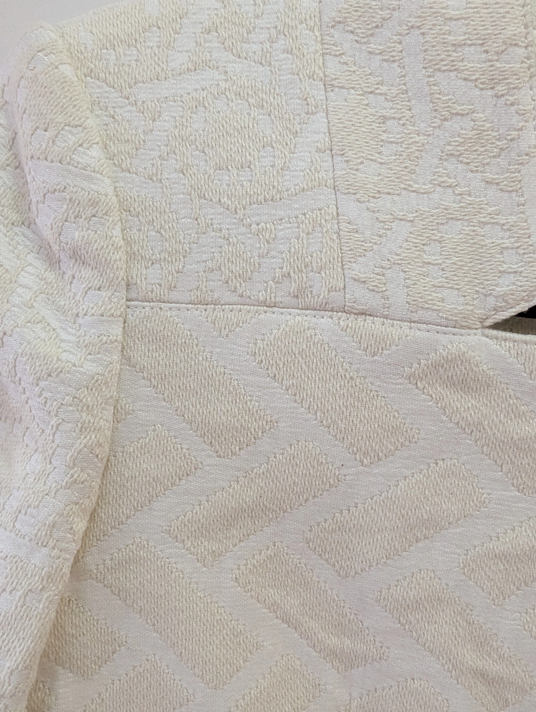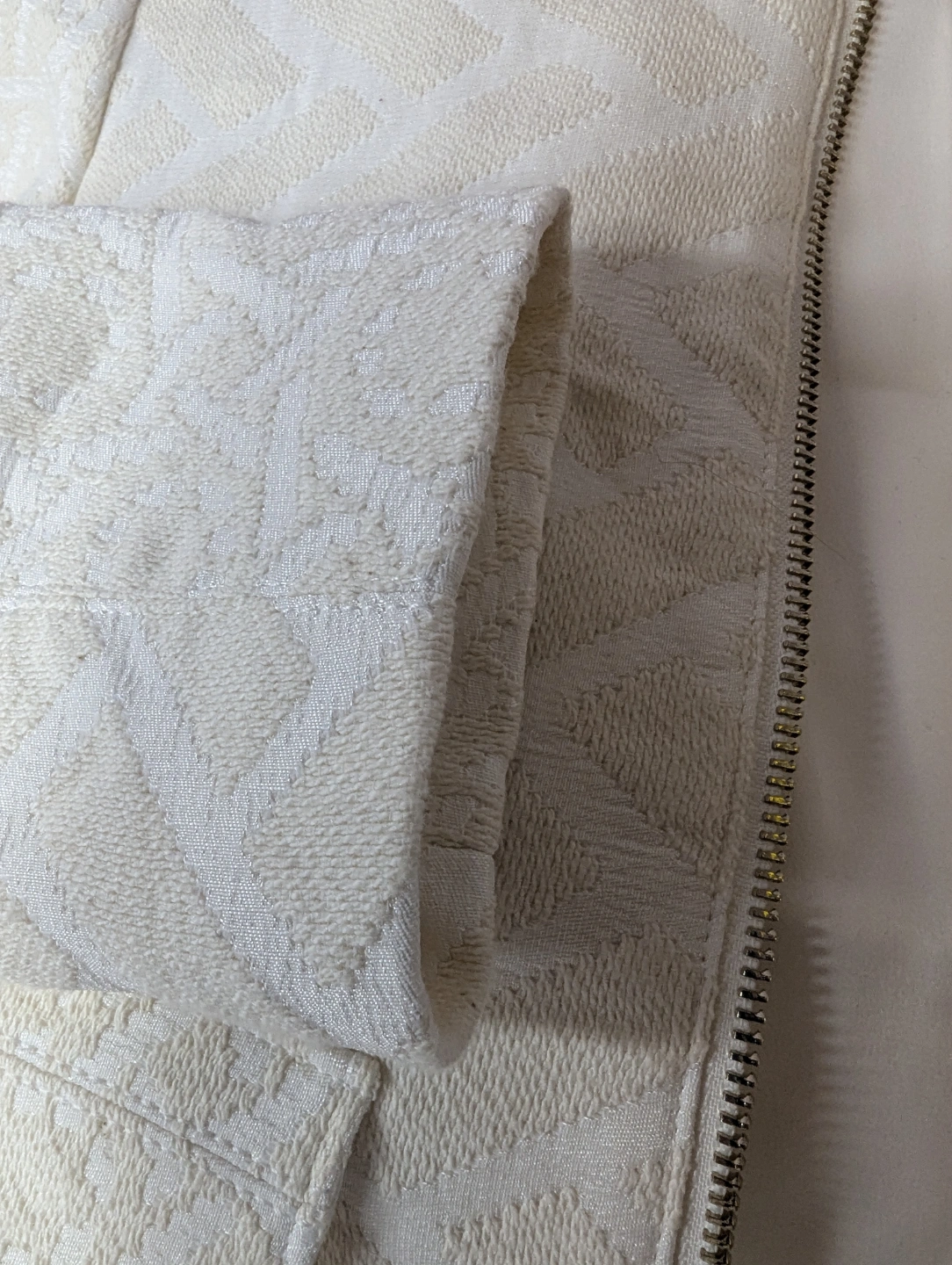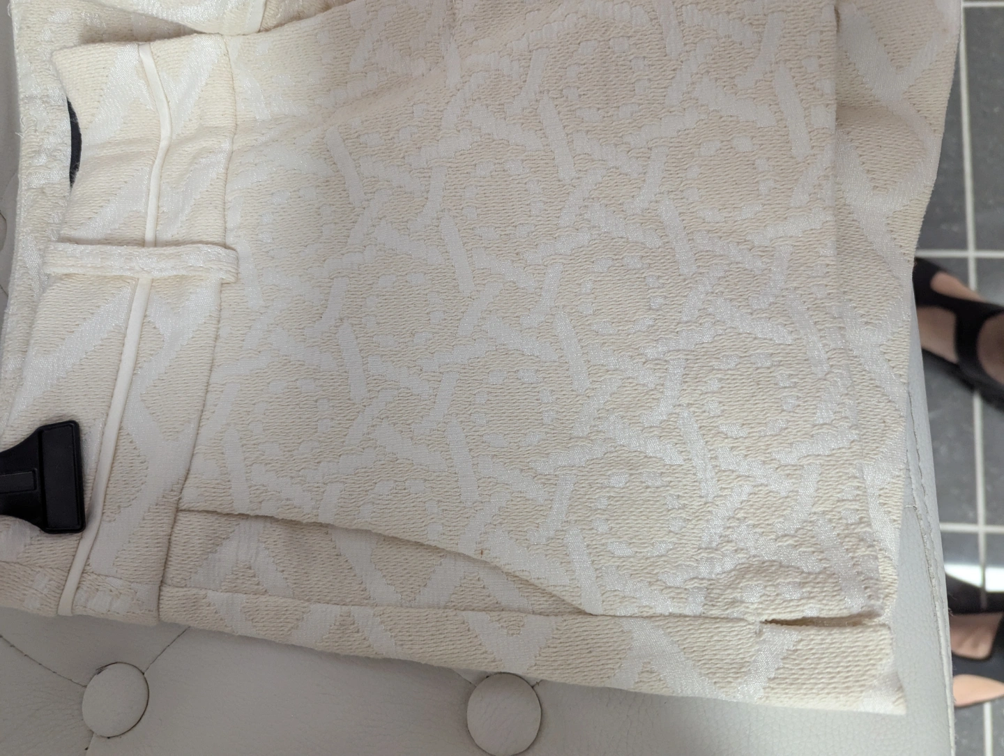 Cream-coloured, textured, zip-up jacket and shorts set. Size 0. Made in China.