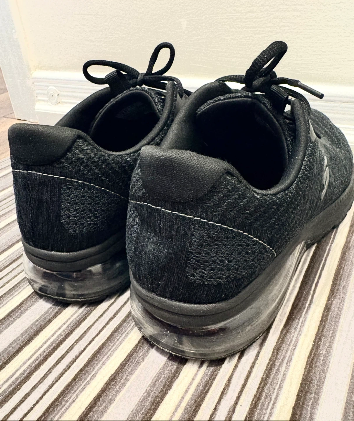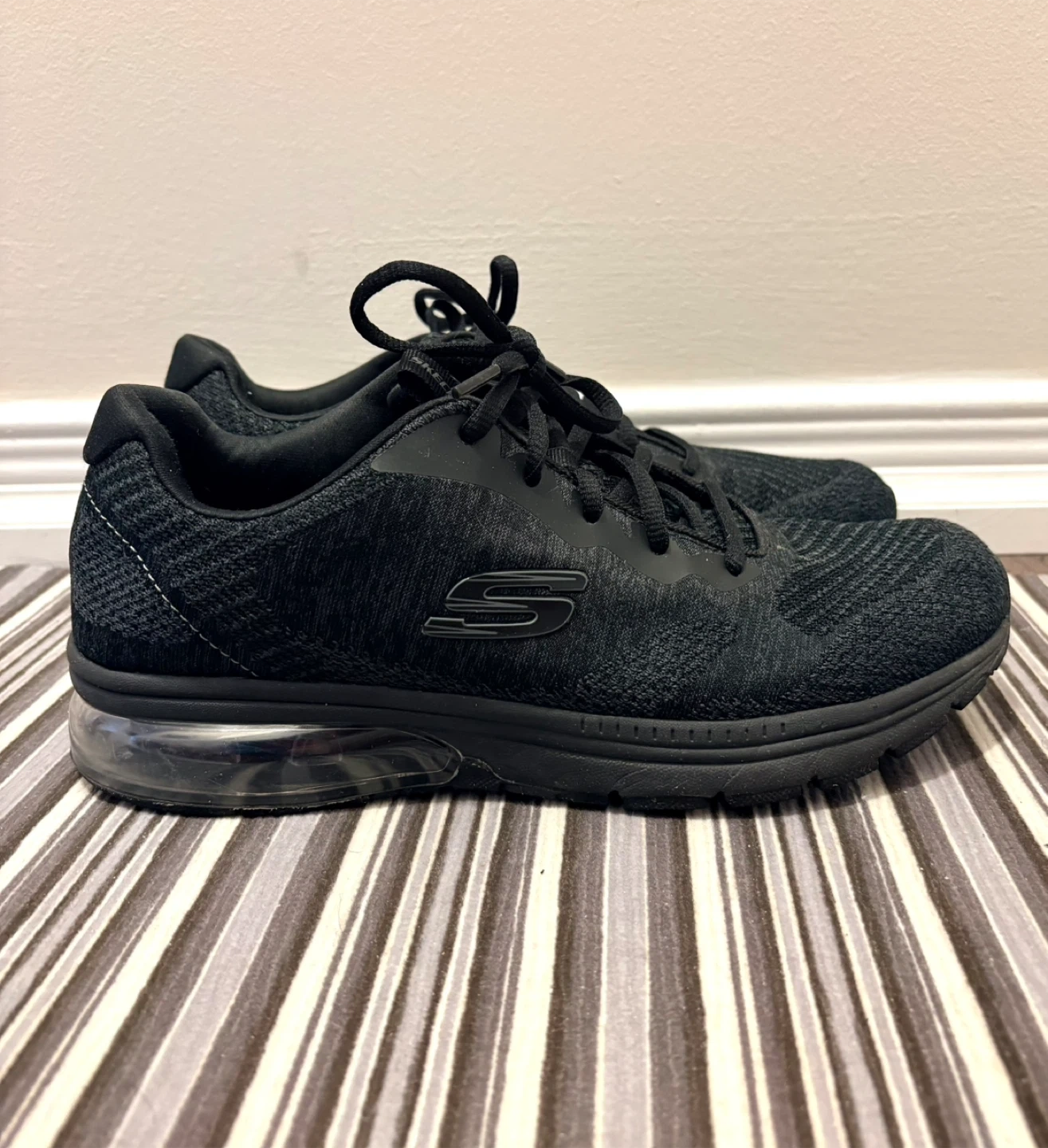 Skechers sneakers in black. Featuring air cushion soles for comfort. Lace-up closure with a breathable knit upper. Size 10 US/ 40 EUR. Excellent for walking or casual wear! Cash only please. Pick up at 5095 Yonge St. Yonge/North york center.