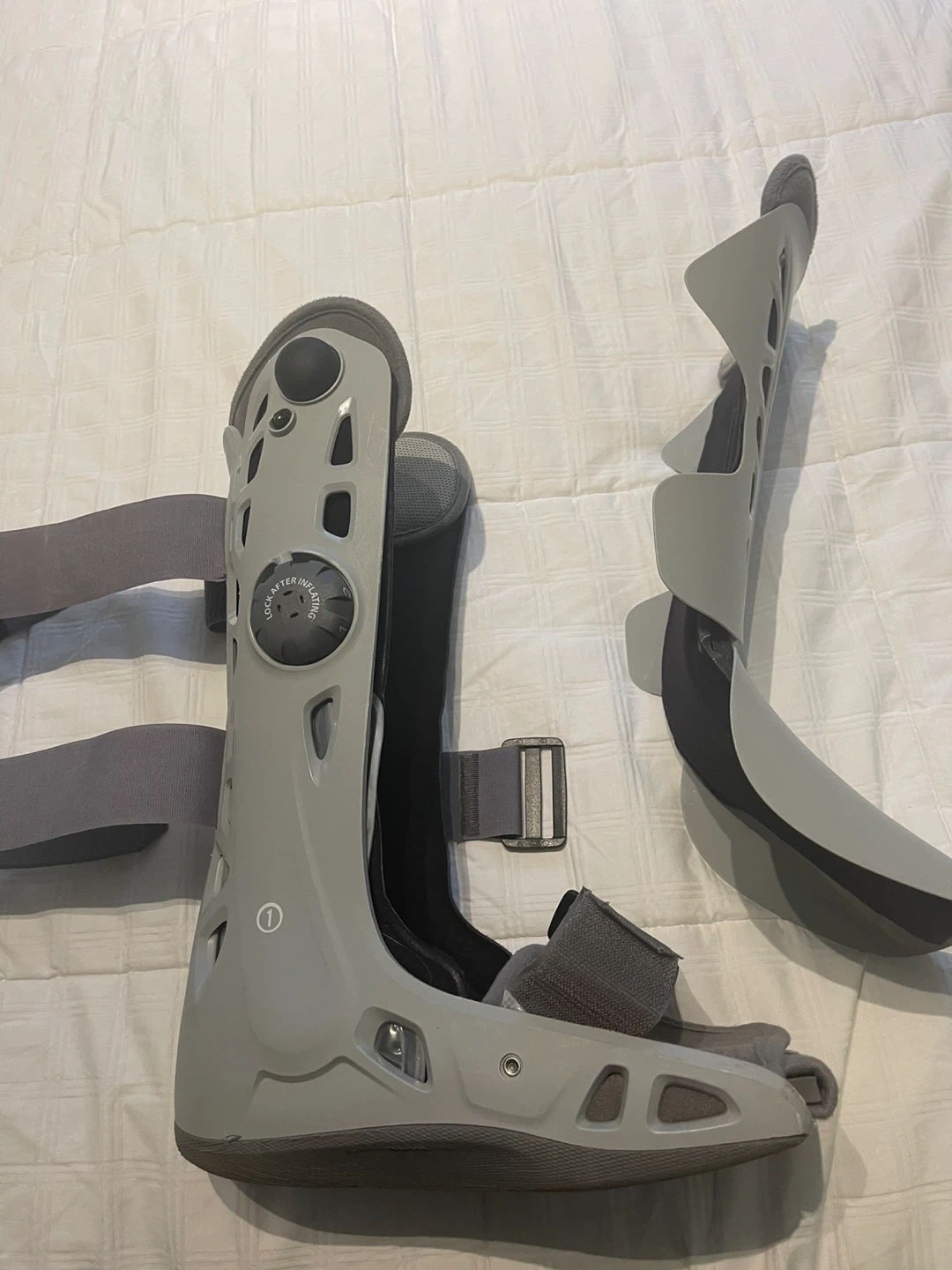 This is a gray walking boot cast for leg support. It has adjustable straps for a secure fit. This boot is useful for recovery after injuries or surgery.