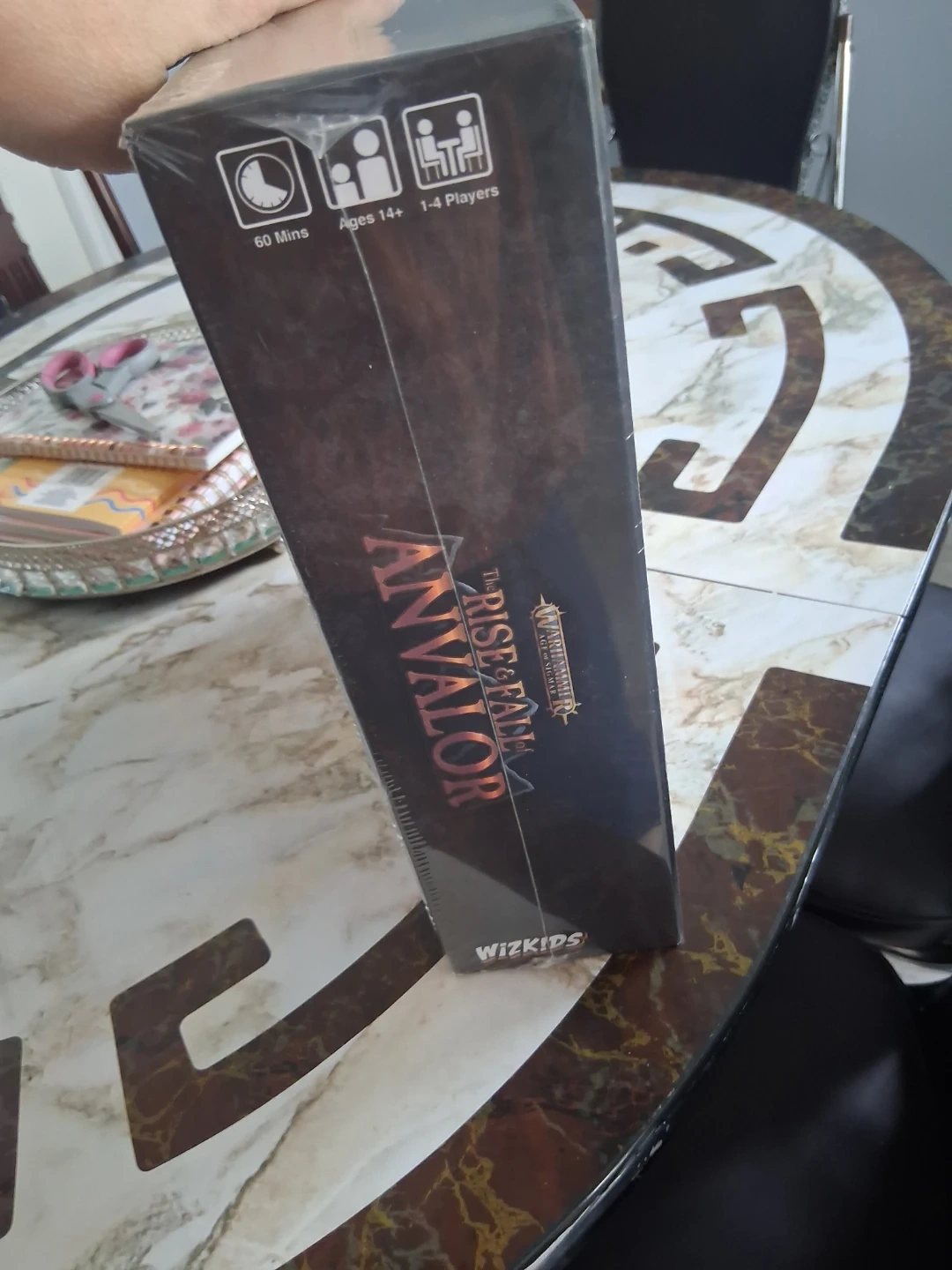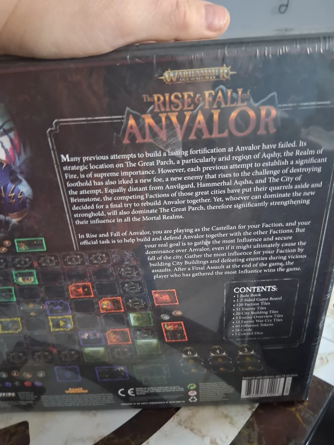 This is the Warhammer Age of Sigmar: The Rise & Fall of Anvalor board game. It's designed for 1-4 players and takes about 60 minutes to play. Ages 14+. Includes a rulebook, game board, faction and enemy tiles, and influence tokens.