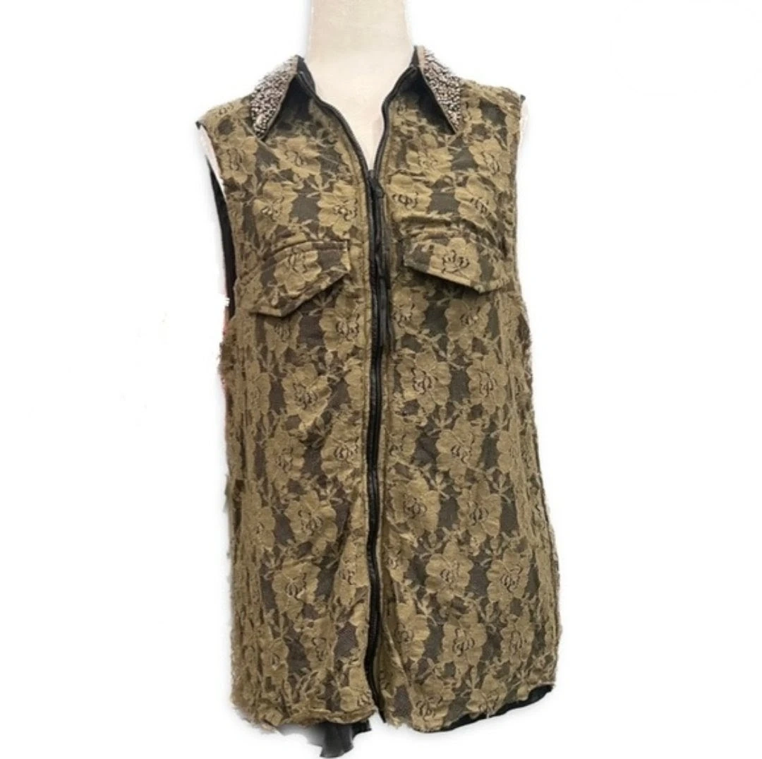 This is a unique sleeveless vest featuring a taupe floral lace overlay on a black lining. It has a contrasting black collar with intricate bead and rhinestone embellishments. A front zipper closure and two chest pockets complete the design.