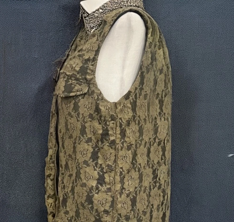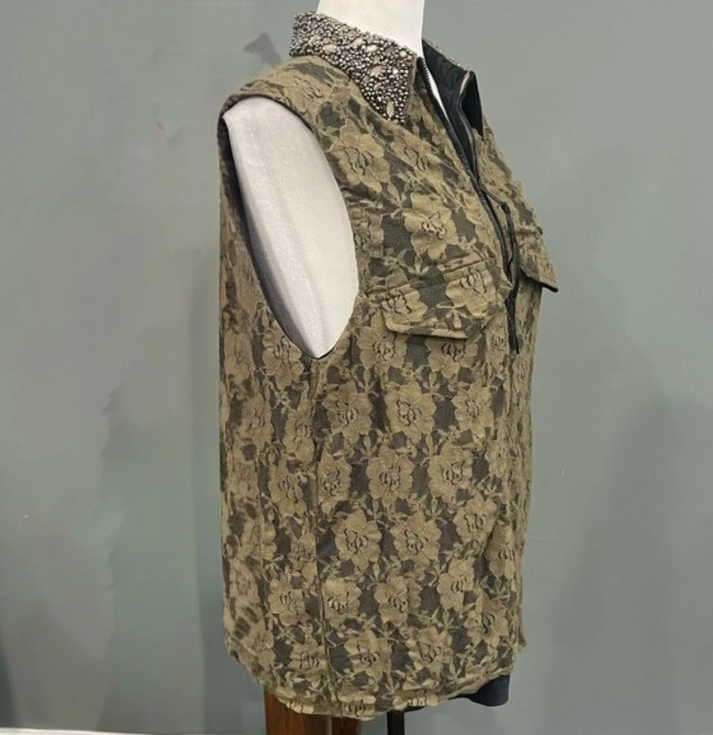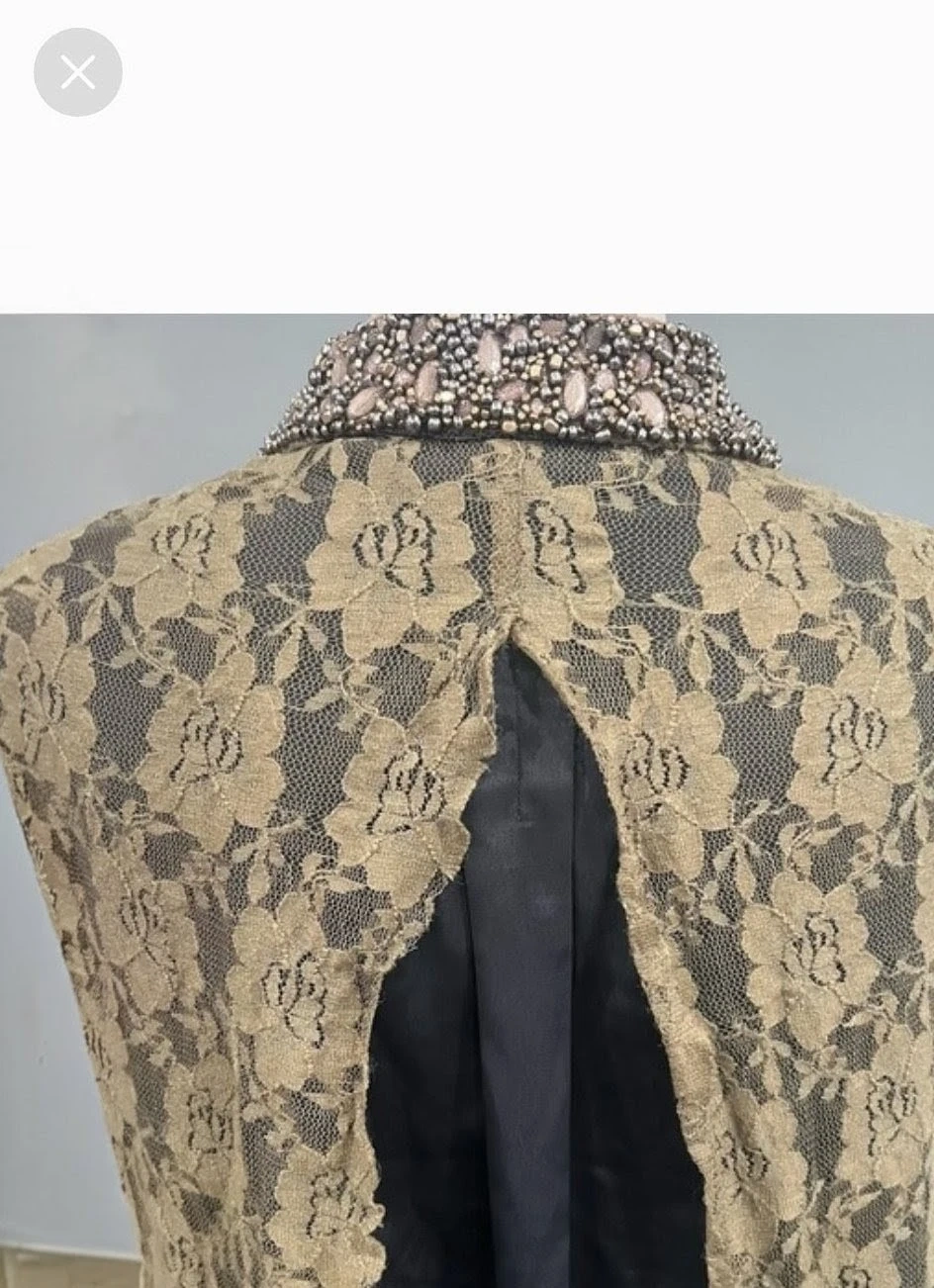This is a unique sleeveless vest featuring a taupe floral lace overlay on a black lining. It has a contrasting black collar with intricate bead and rhinestone embellishments. A front zipper closure and two chest pockets complete the design.