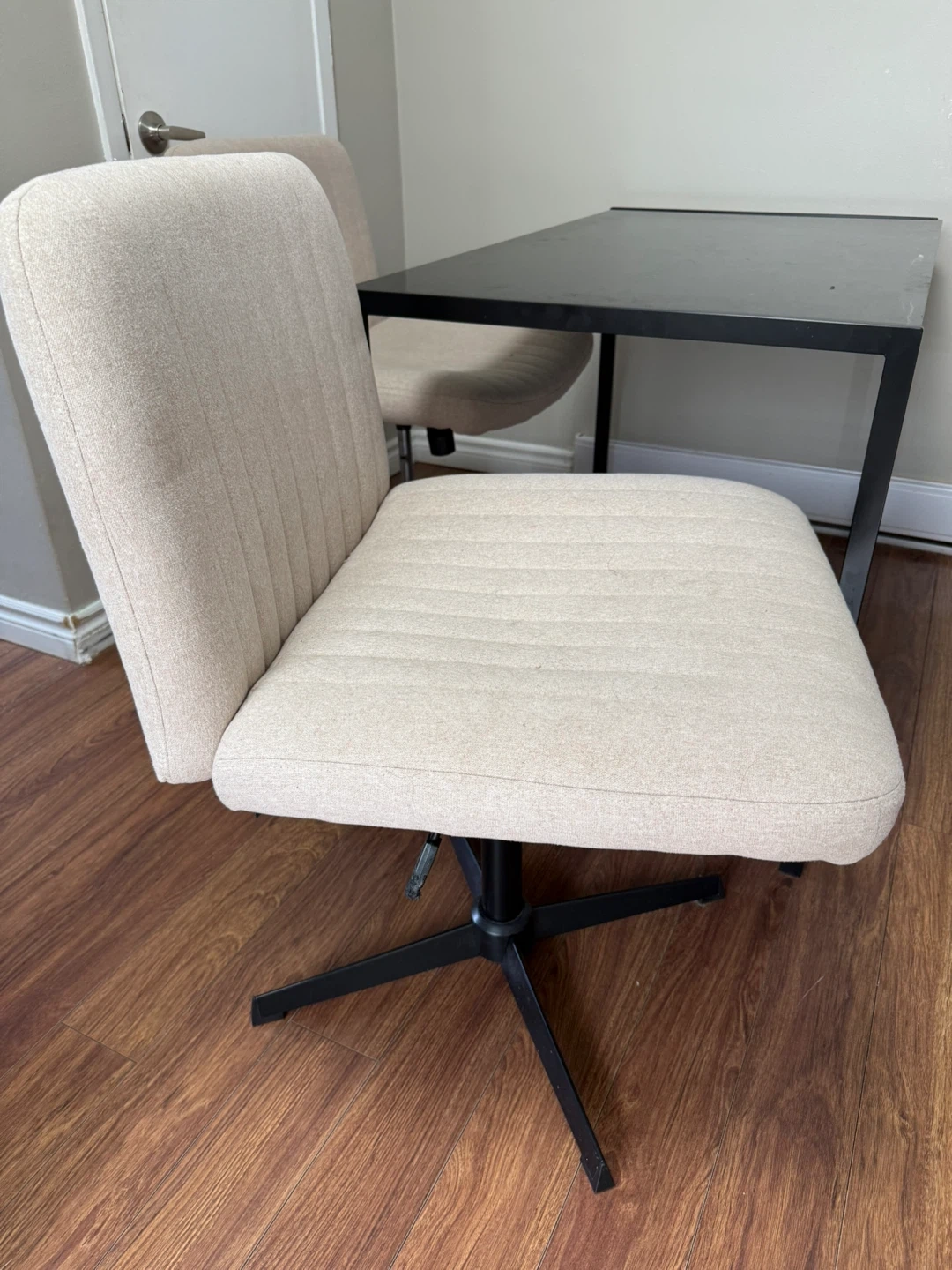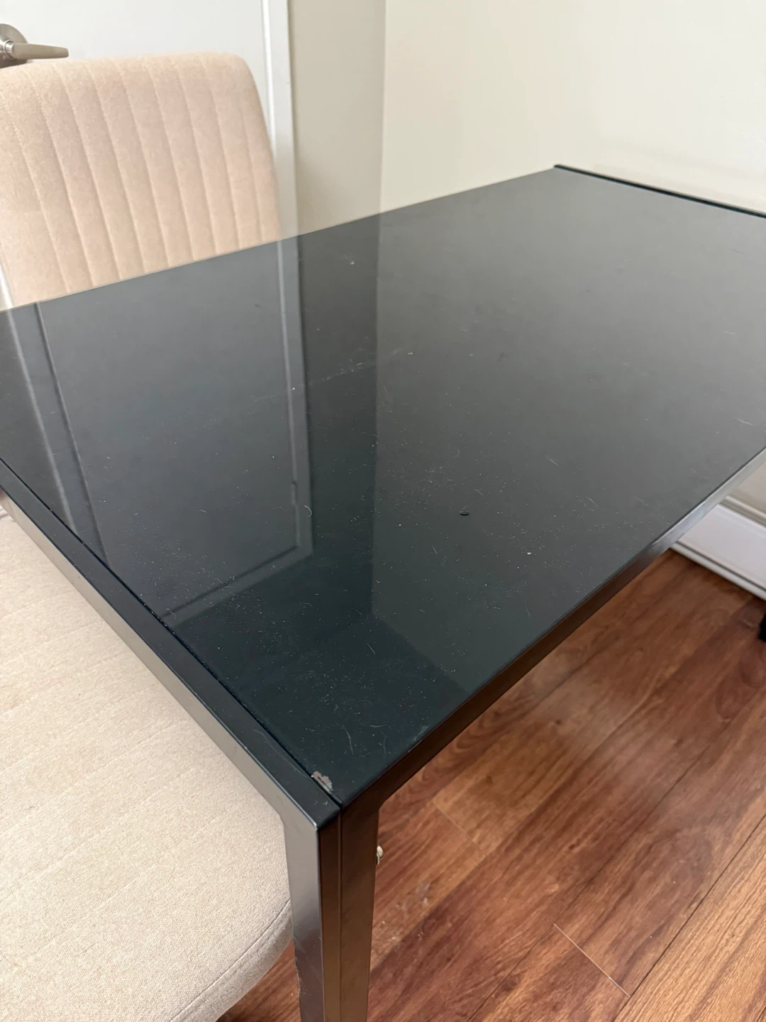 Set a dining table black glass top and a sturdy black metal frame with two armless beiges chairs comfortably seats two to four people. This set is great for small apartments or as a breakfast nook table.