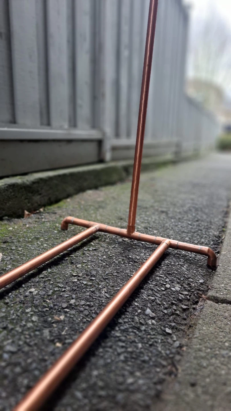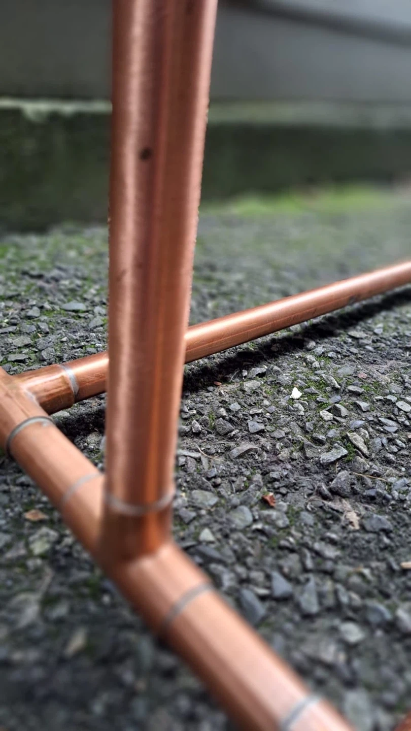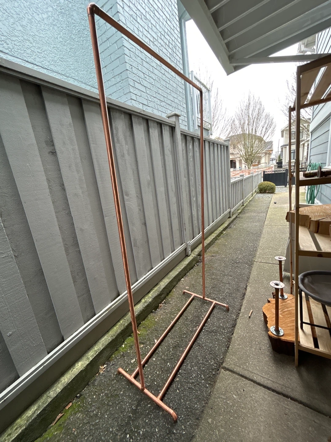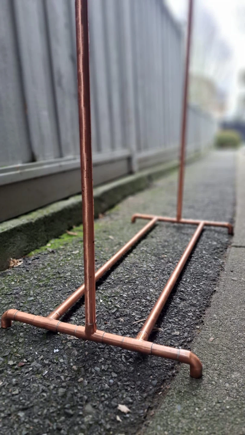 Freestanding copper pipe garment rack. It's a unique, industrial-style display stand perfect for boutiques or personal use. Constructed from durable pure L type copper piping by hand. Polished and coated, no cleaning necessary from oxidation.