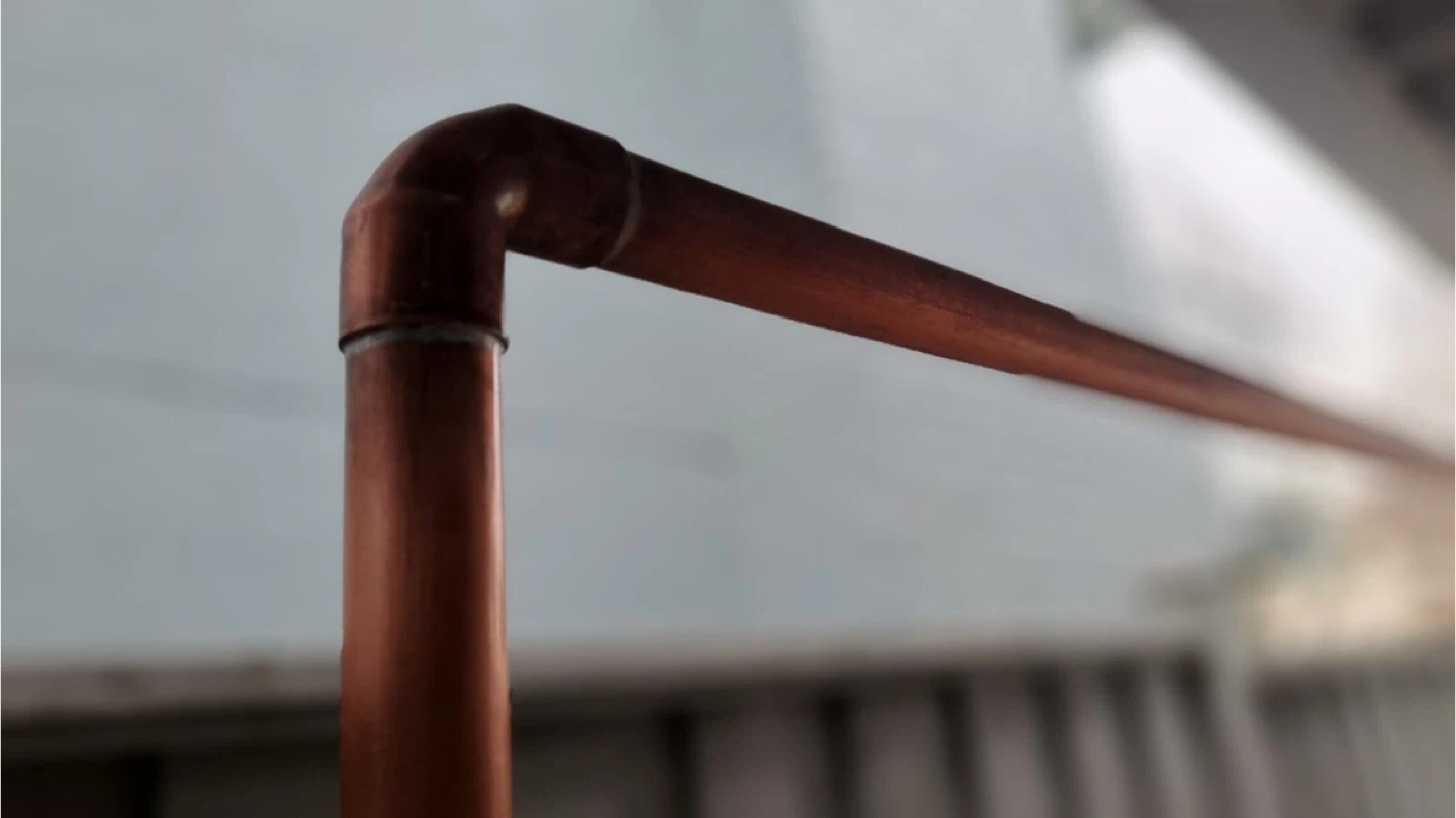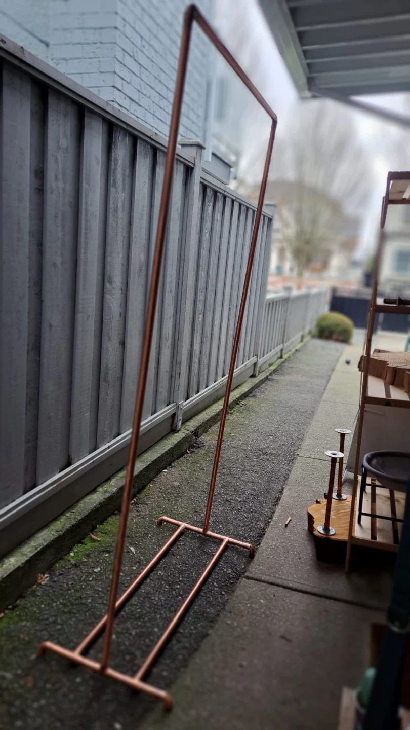 Freestanding copper pipe garment rack. It's a unique, industrial-style display stand perfect for boutiques or personal use. Constructed from durable pure L type copper piping by hand. Polished and coated, no cleaning necessary from oxidation.