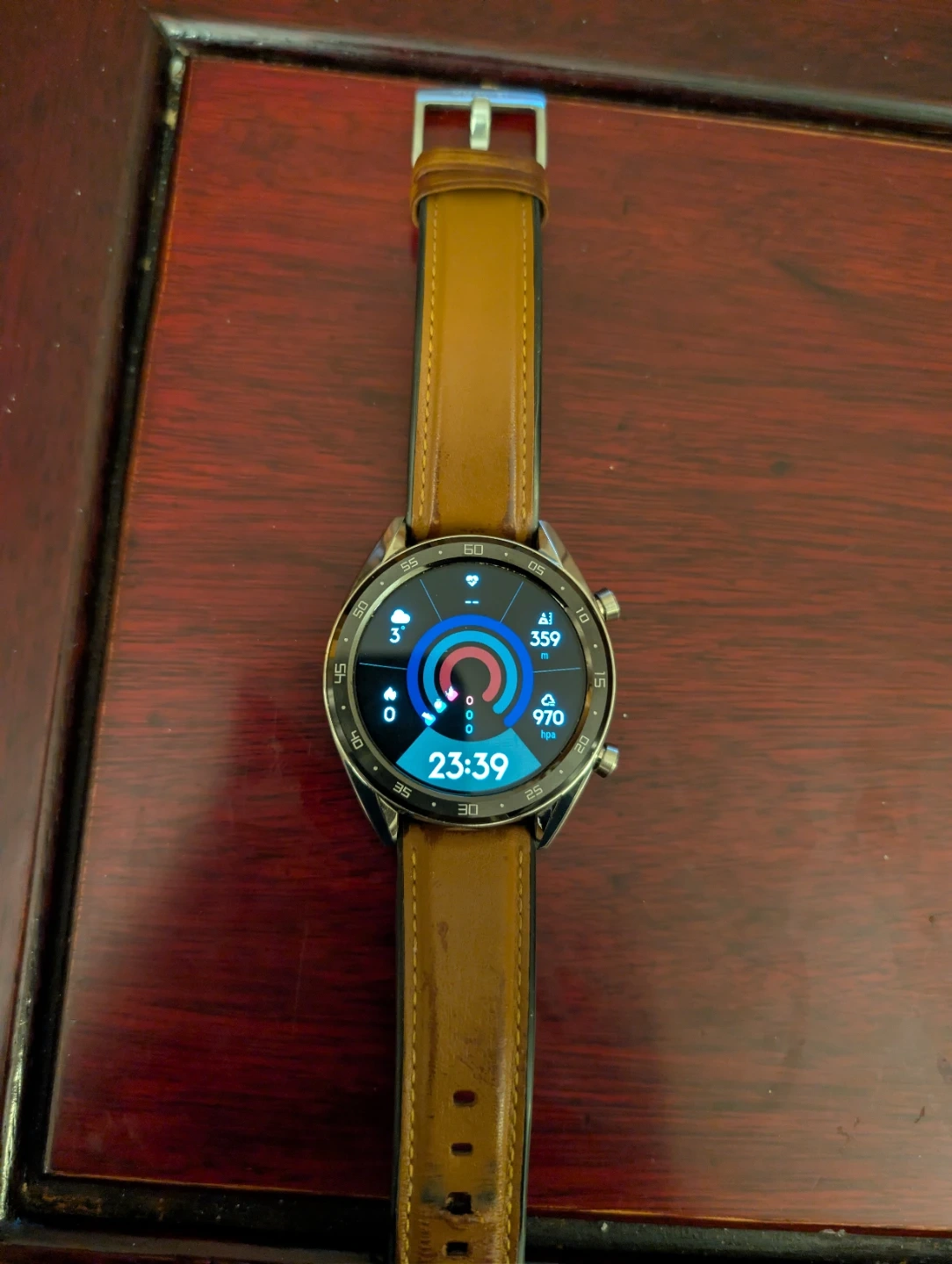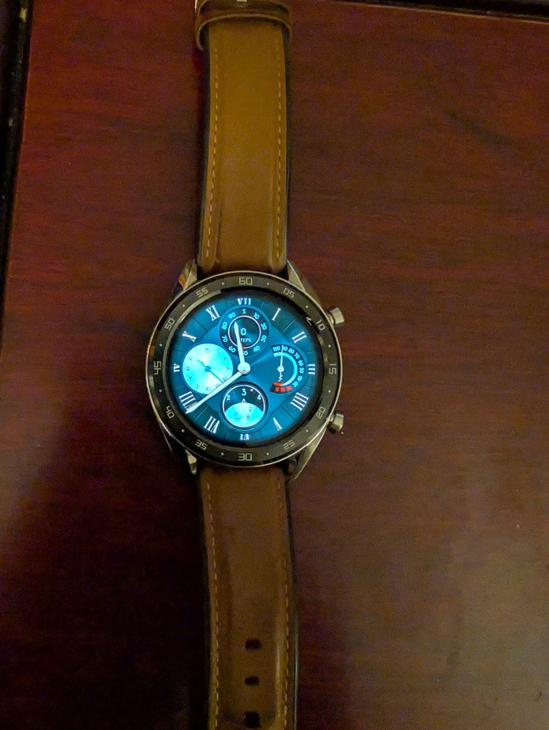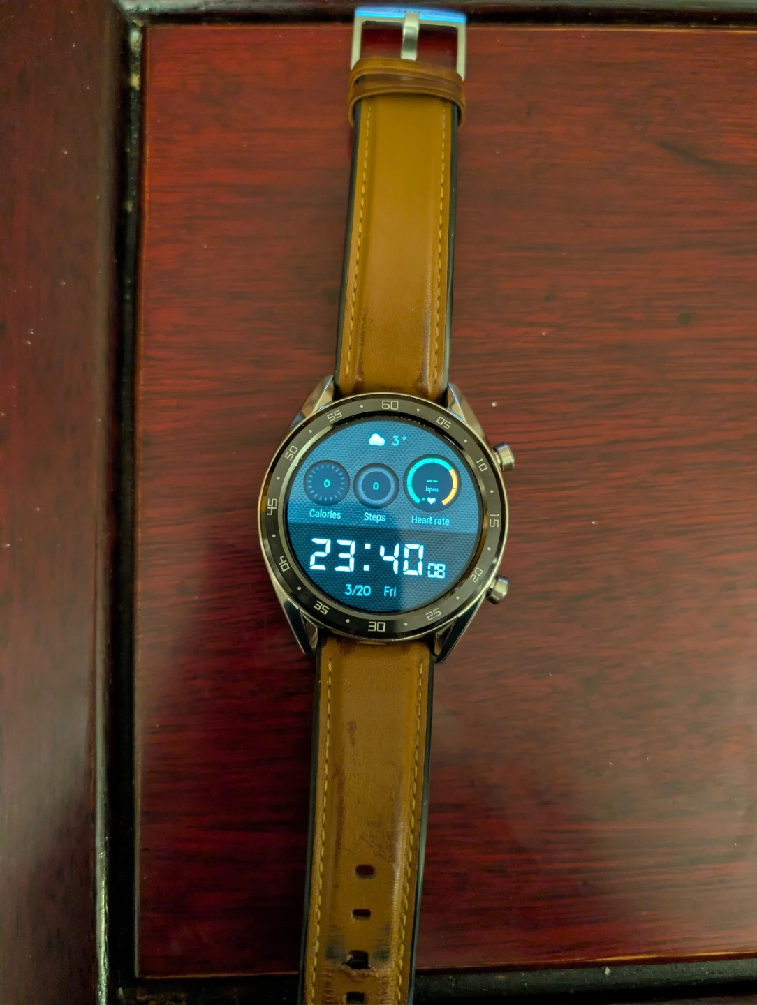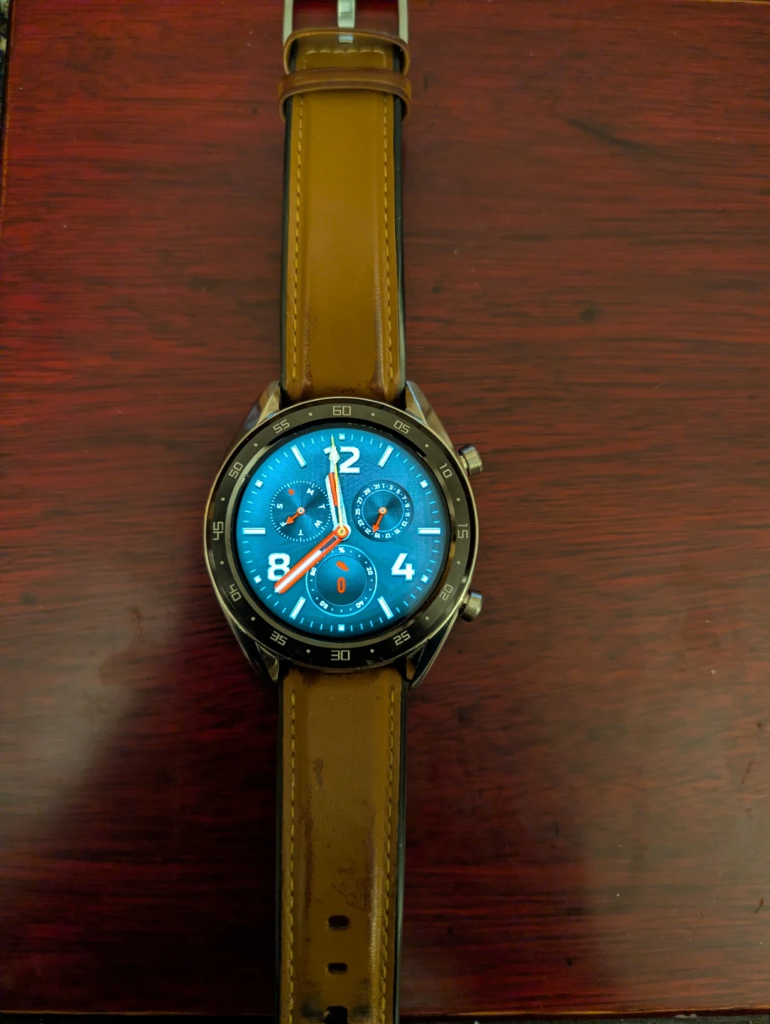 This is a Huawei Watch GT with a brown leather strap. It tracks calories, steps, and heart rate.