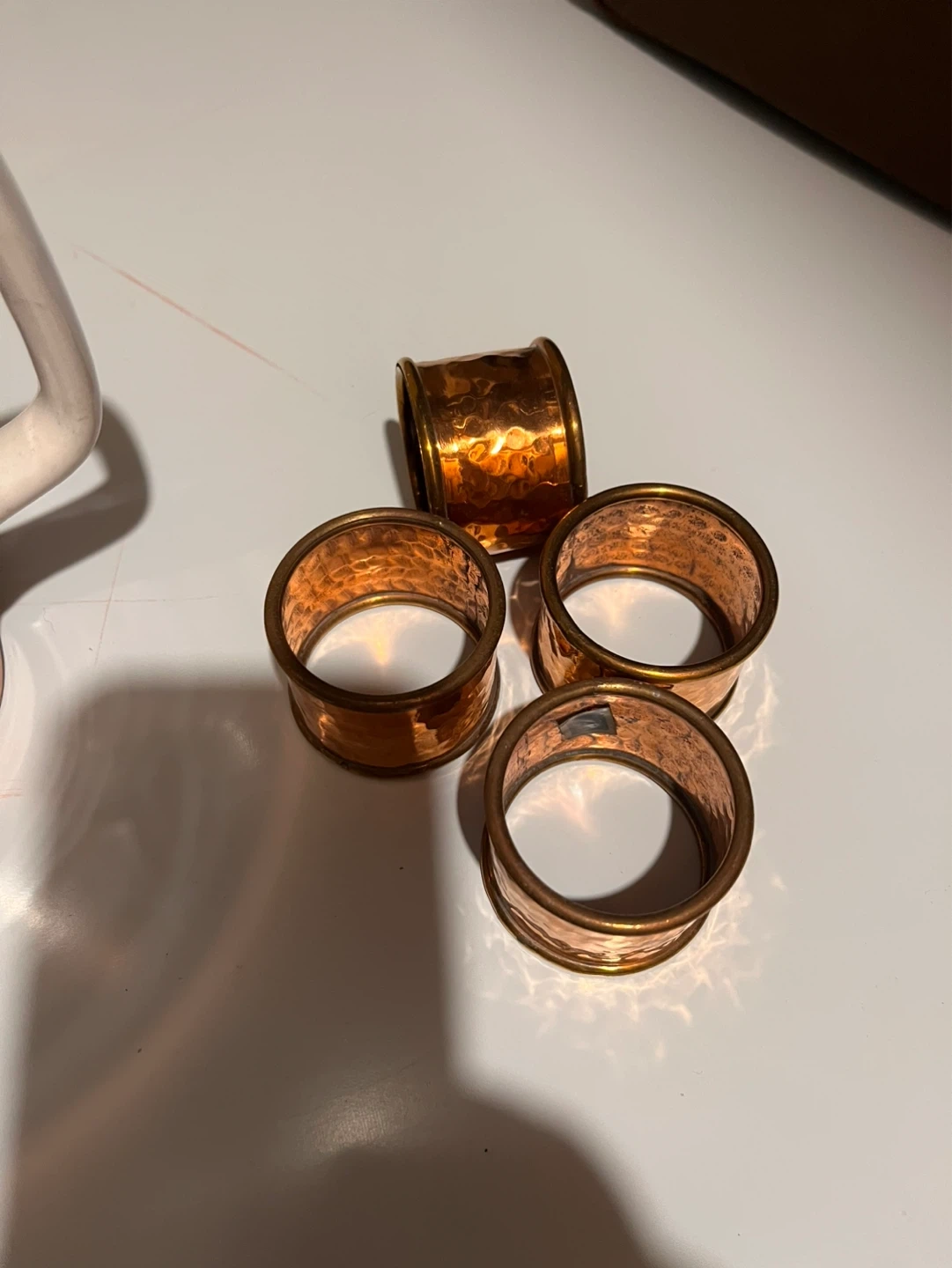 These are four hammered copper napkin rings. They're a warm, rustic addition to any table setting. Each ring has a textured, hammered finish.