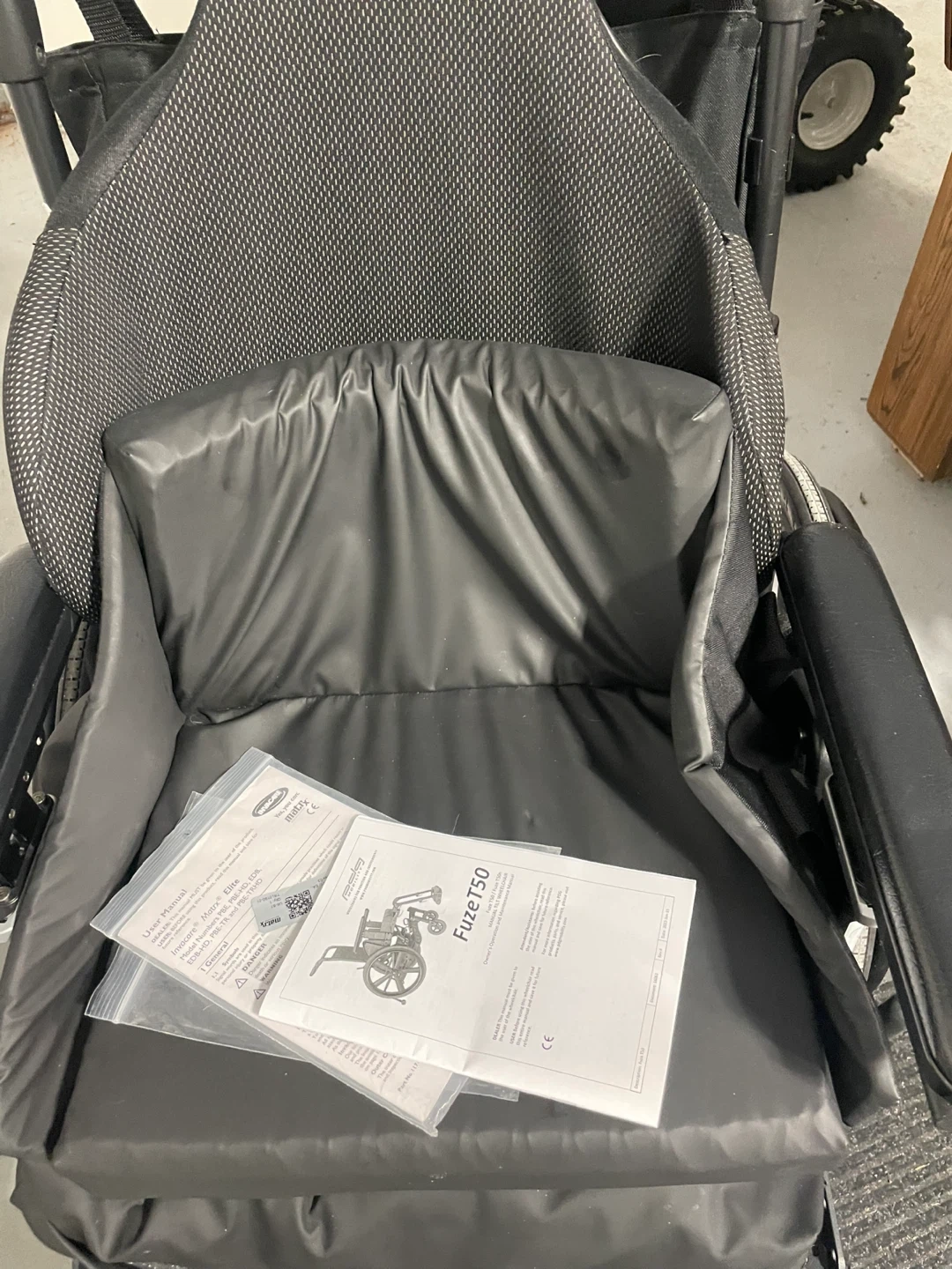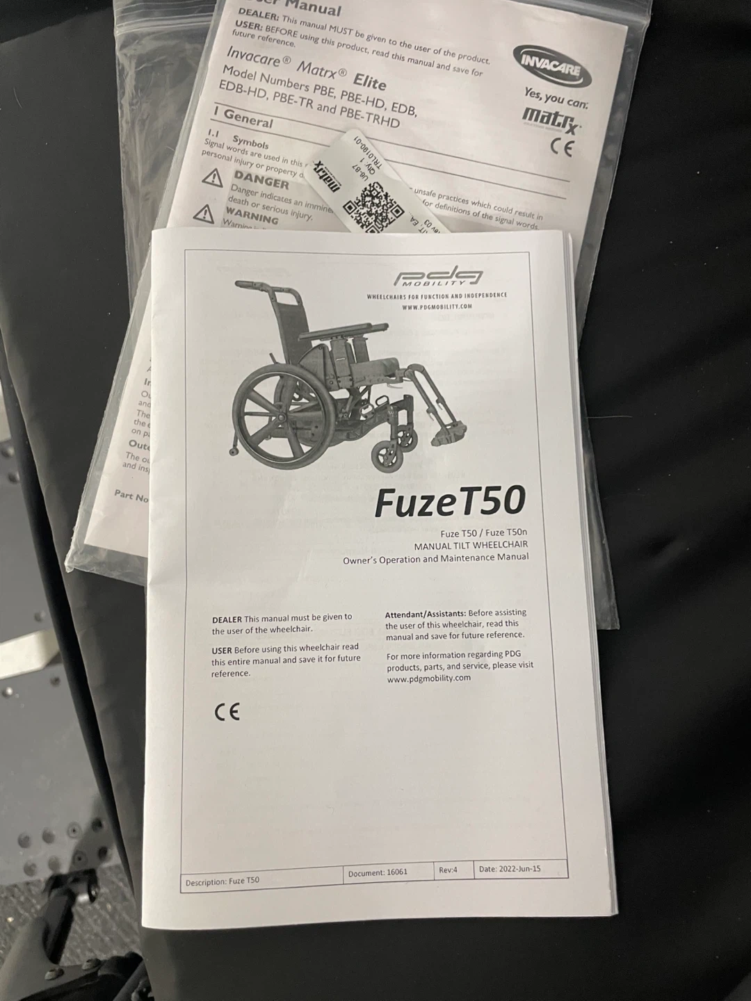 PDG Mobility Fuze T50 manual tilt wheelchair. Includes owner's operation and maintenance manual. Great for providing customized positioning and support. It's a durable and reliable mobility solution.