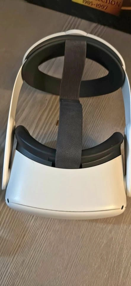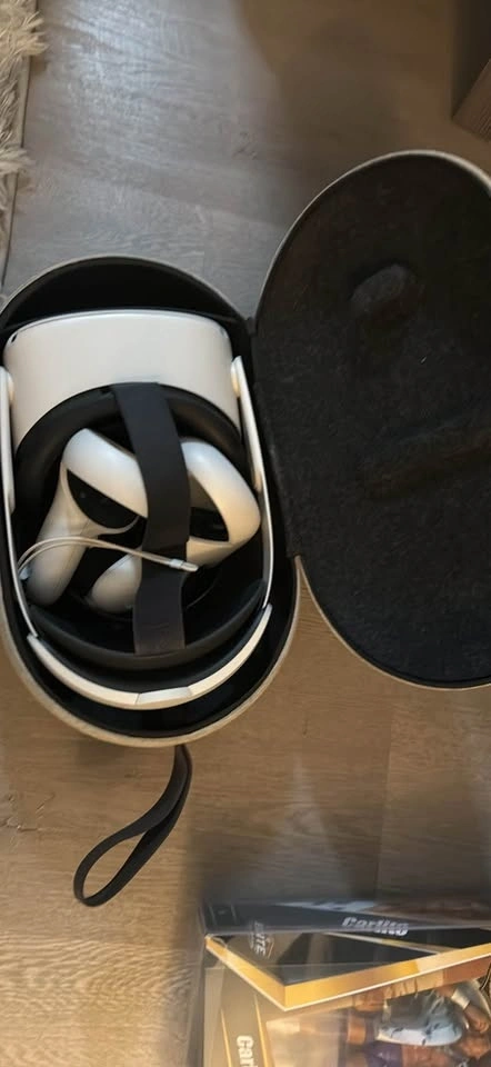 Cool Meta Quest 2 VR set for sale. Comes with the headset, two controllers, and a travel case. Everything you need for virtual reality gaming.