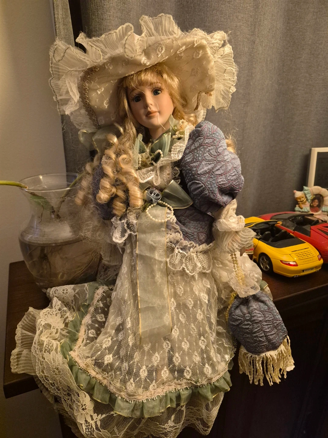 This is a lovely vintage porcelain doll. She's dressed in an elaborate blue and lace Victorian-style gown with a matching hat. The doll has beautiful blonde curly hair and delicate painted features. It's a charming decorative piece.