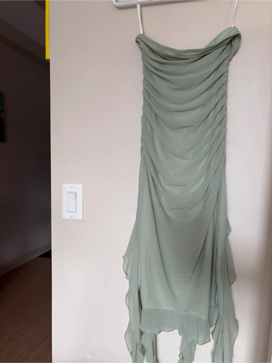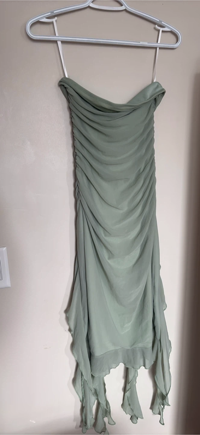 This sage green strapless dress features beautiful ruched detailing. It has a flowy, asymmetrical hemline with ruffles. Made from a lightweight chiffon material. Pick up bridgeland NE 🤗 Check out my other listings ❤️ Delivery available for a fee or free delivery within Calgary when 150 or more is spent 💃 Cash or email transfer accepted 💰 Smoke free and pet free home❌🙅