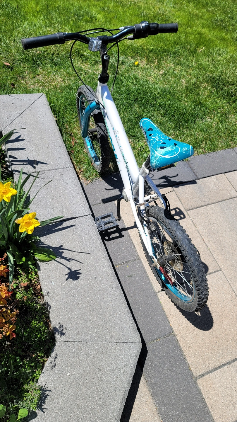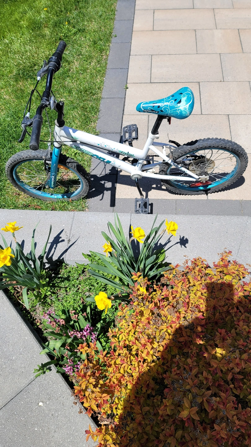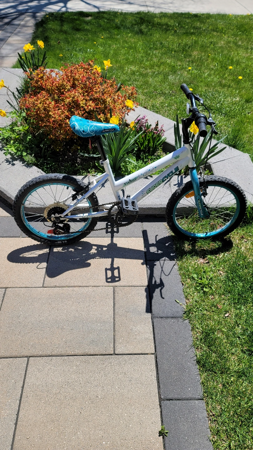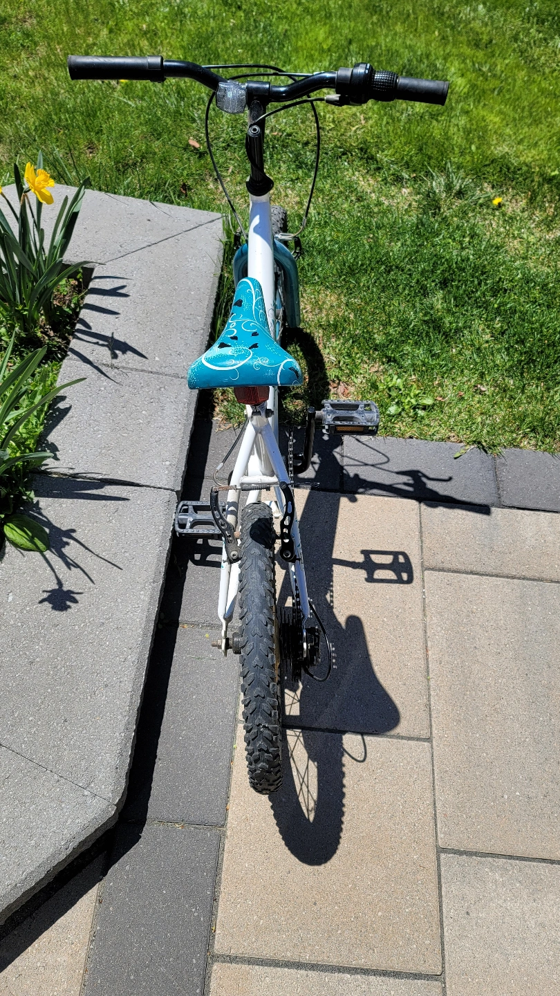 White and teal kids' bike. Features 20-inch wheels and a teal patterned seat. Ready for summer adventures!