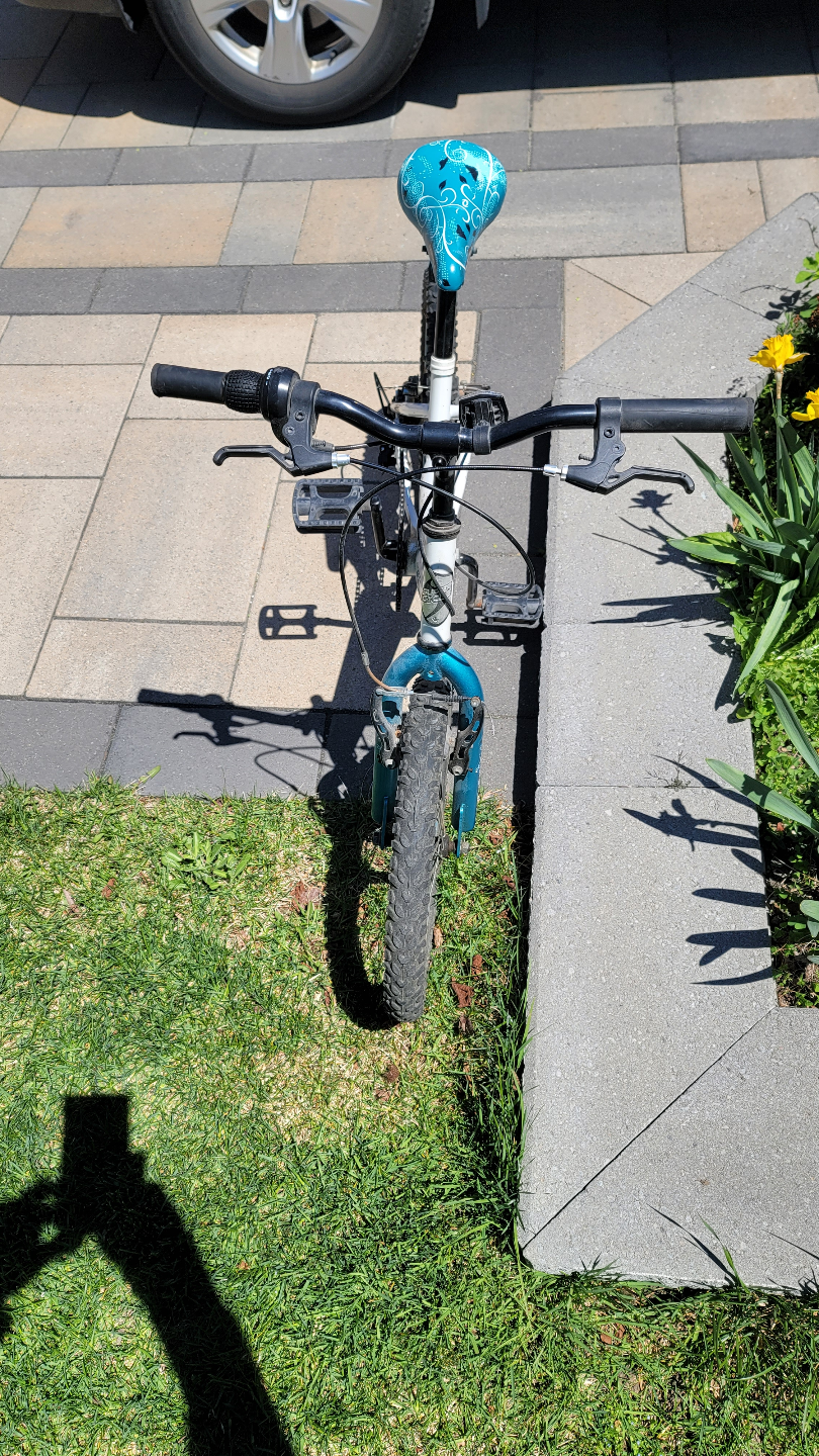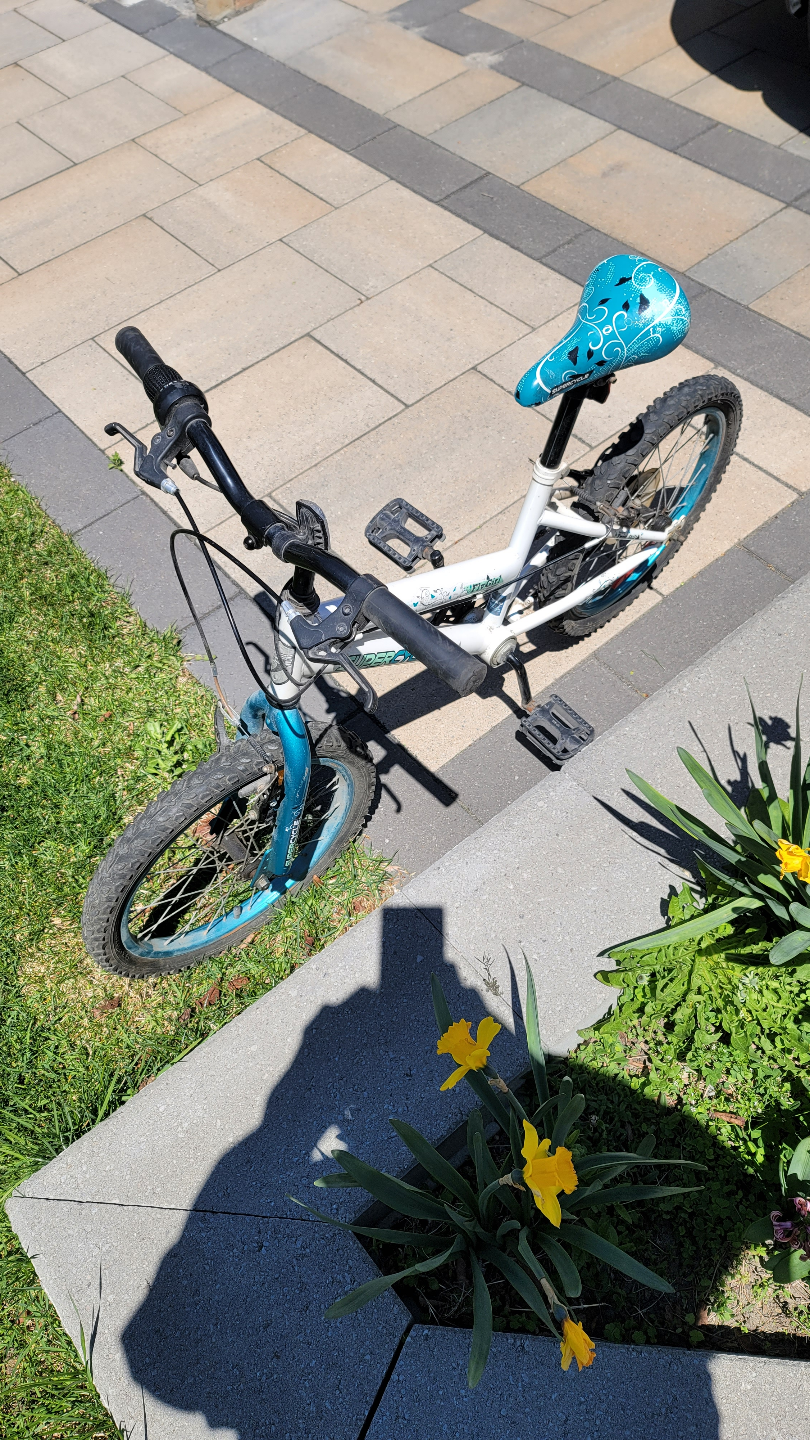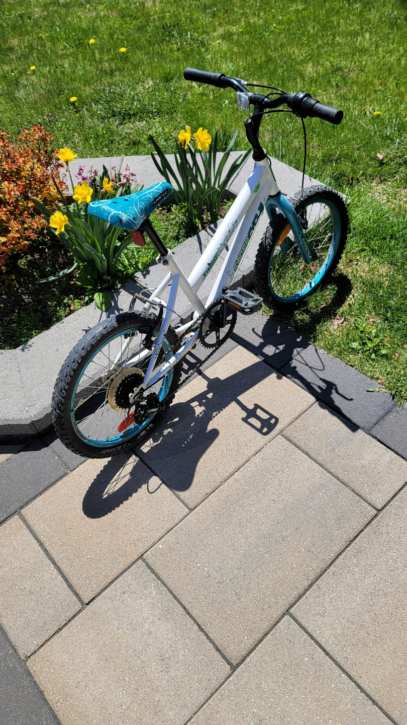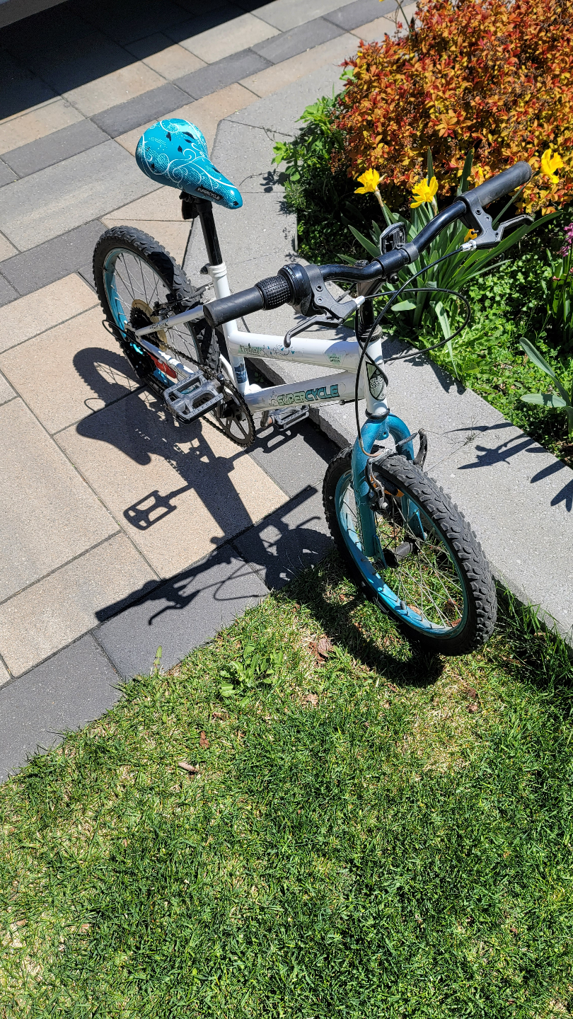 White and teal kids' bike. Features 20-inch wheels and a teal patterned seat. Ready for summer adventures!