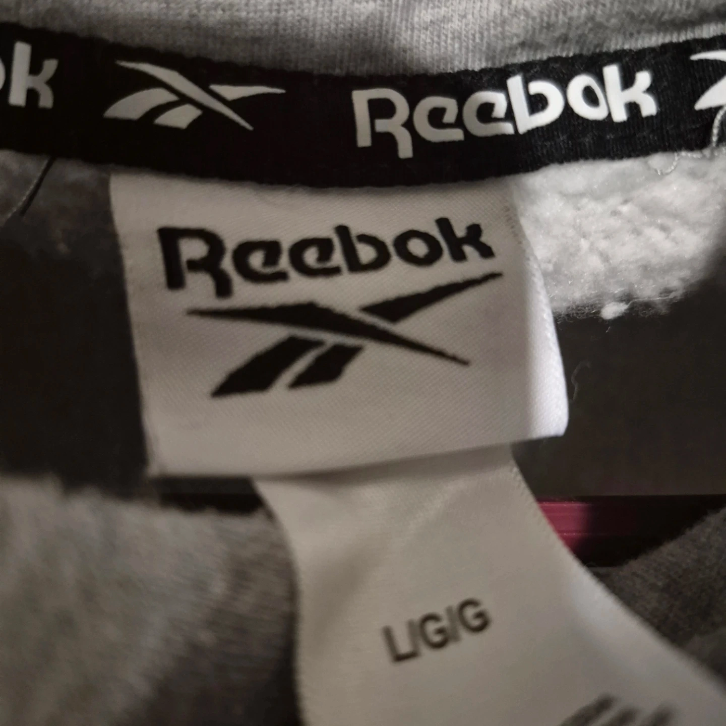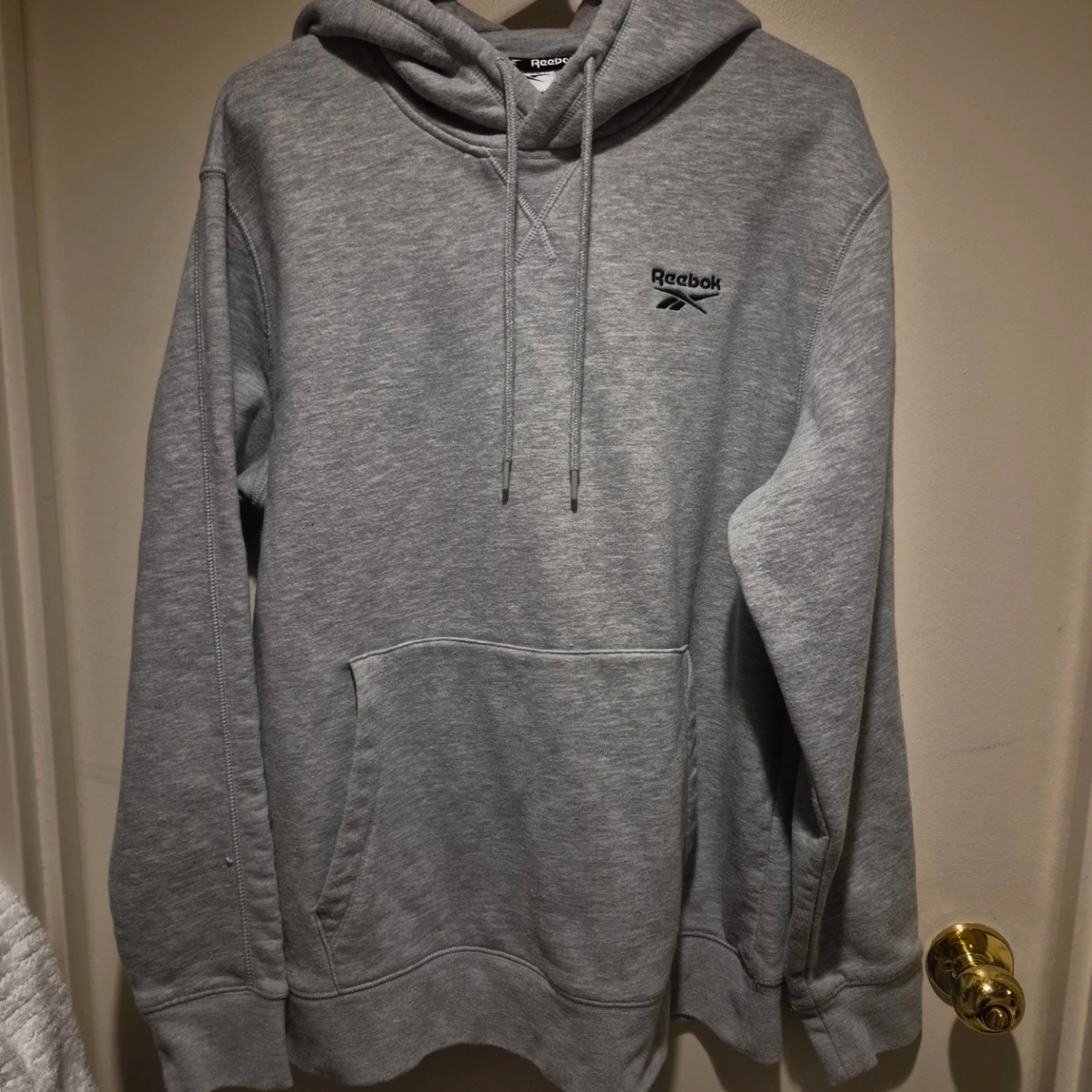 Reebok grey hoodie with a kangaroo pocket and a drawstring hood. It's a size L. Made with a soft cotton blend.