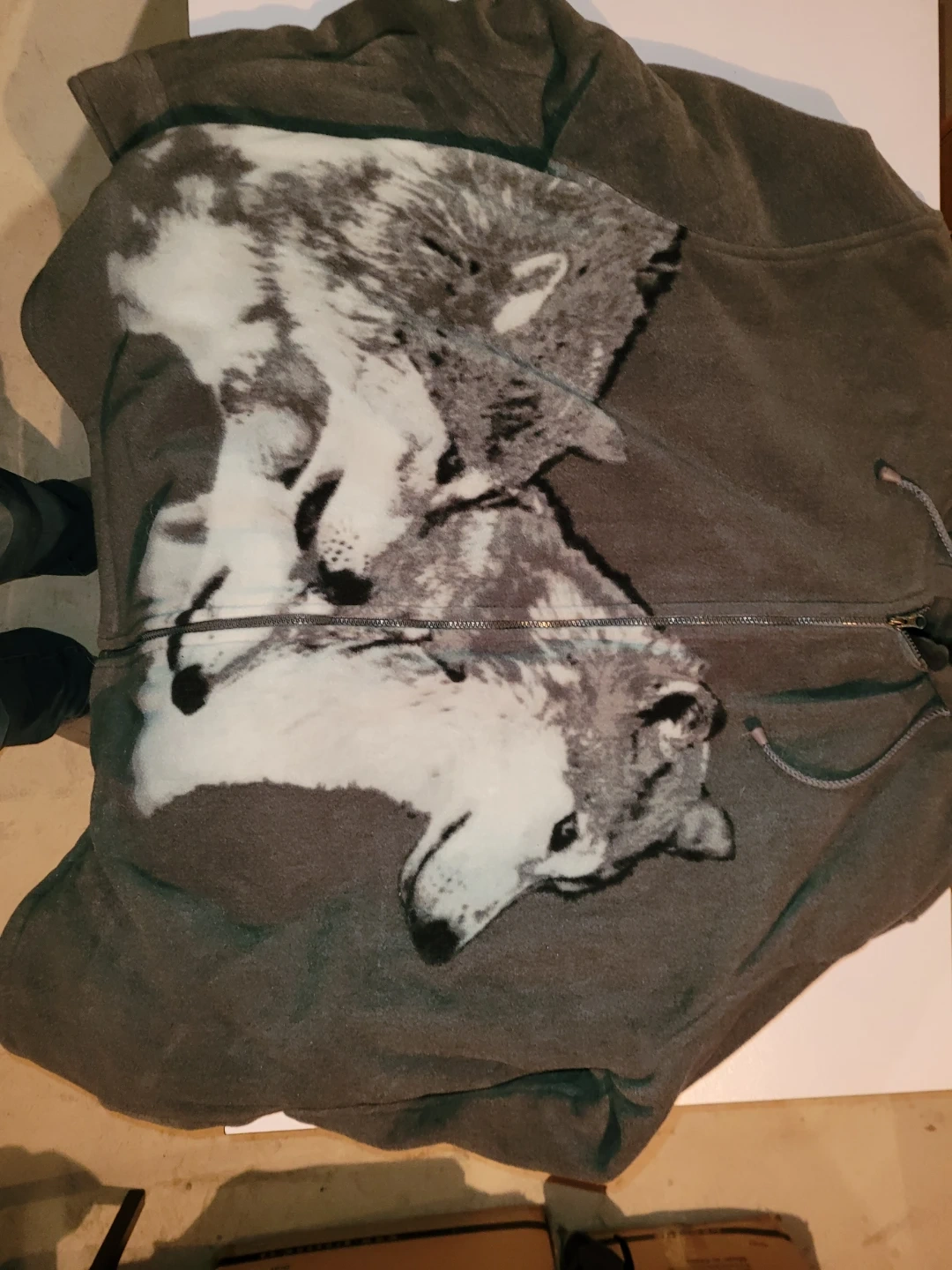 This Mountain Ridge hoodie is dark grey with a wolf graphic on the front. It's sherpa lined for extra warmth. Size 3X/3G. New never worn only removed tags