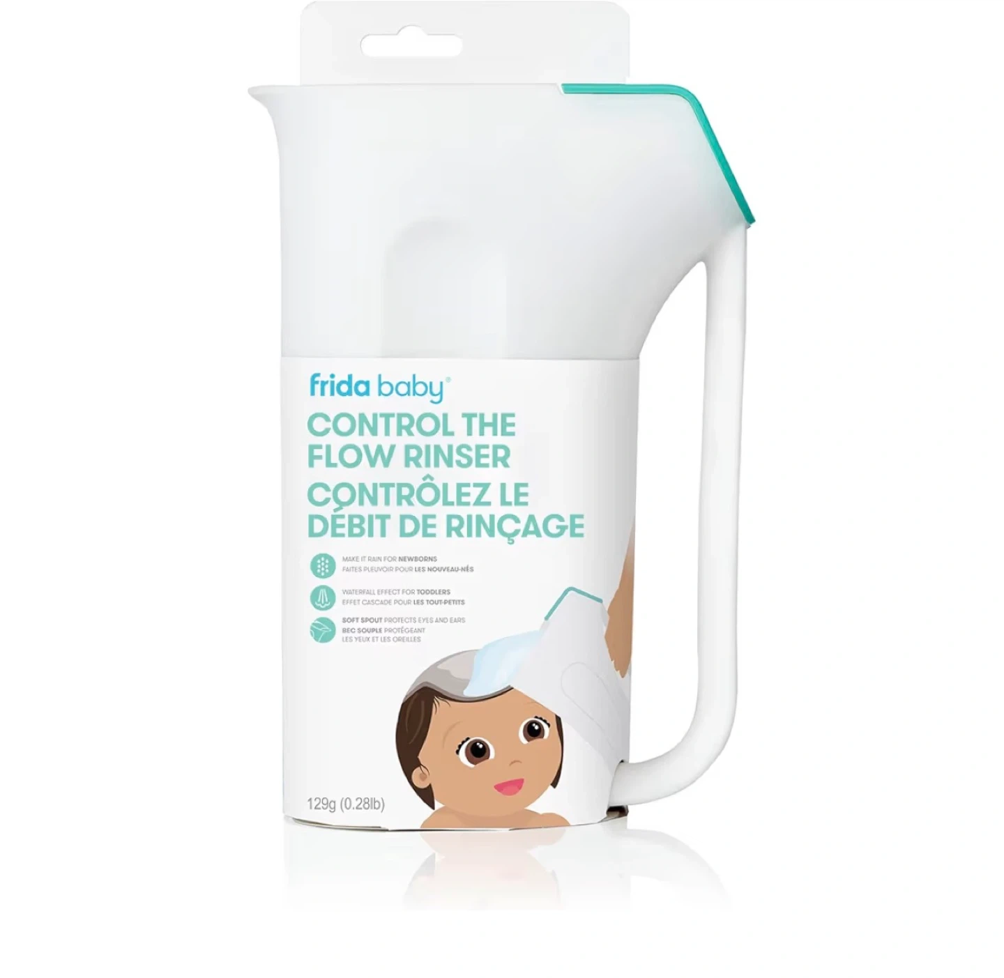 Frida Baby Control the Flow Rinser for newborns. It has a soft spout that protects eyes and ears. Great for making bath time easier!