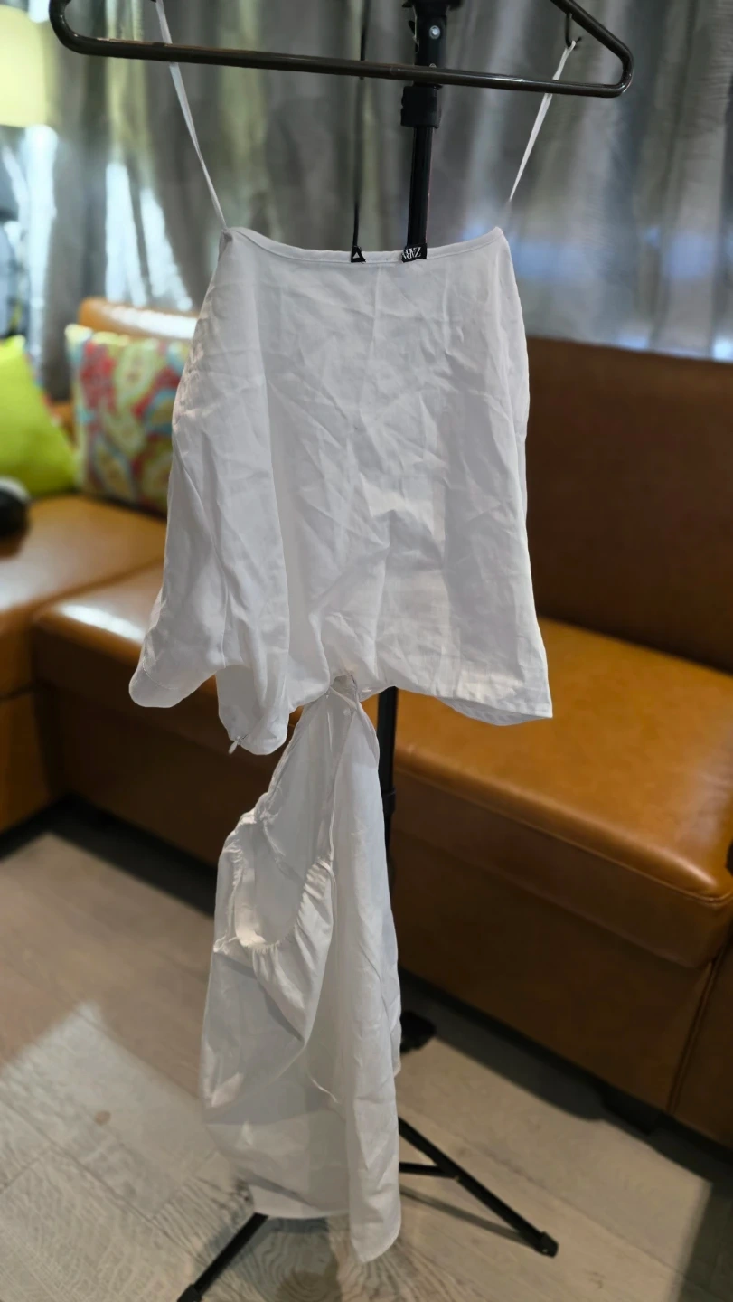 A flowy white mini detached gown It's made of a lightweight fabric and features a drawstring detail at the waist. is perfect for warm weather.