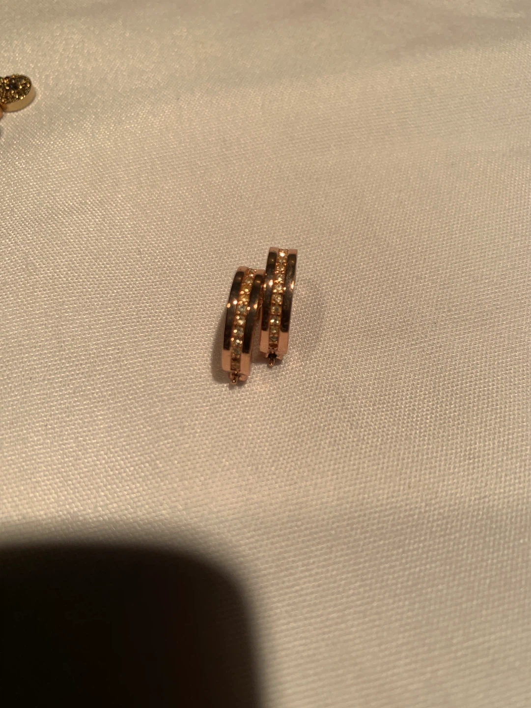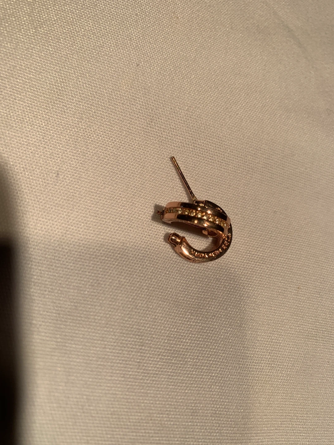 These COACH hoop earrings have a rose gold tone finish. They feature a textured band with small crystal accents. Perfect for adding a touch of sparkle to any outfit!