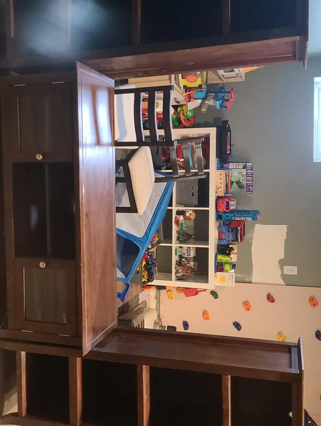 A dark wood entertainment unit with shelves and cabinet space. It's perfect for organizing media or displaying items. Plenty of storage for a living room or entertainment space.