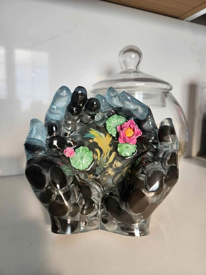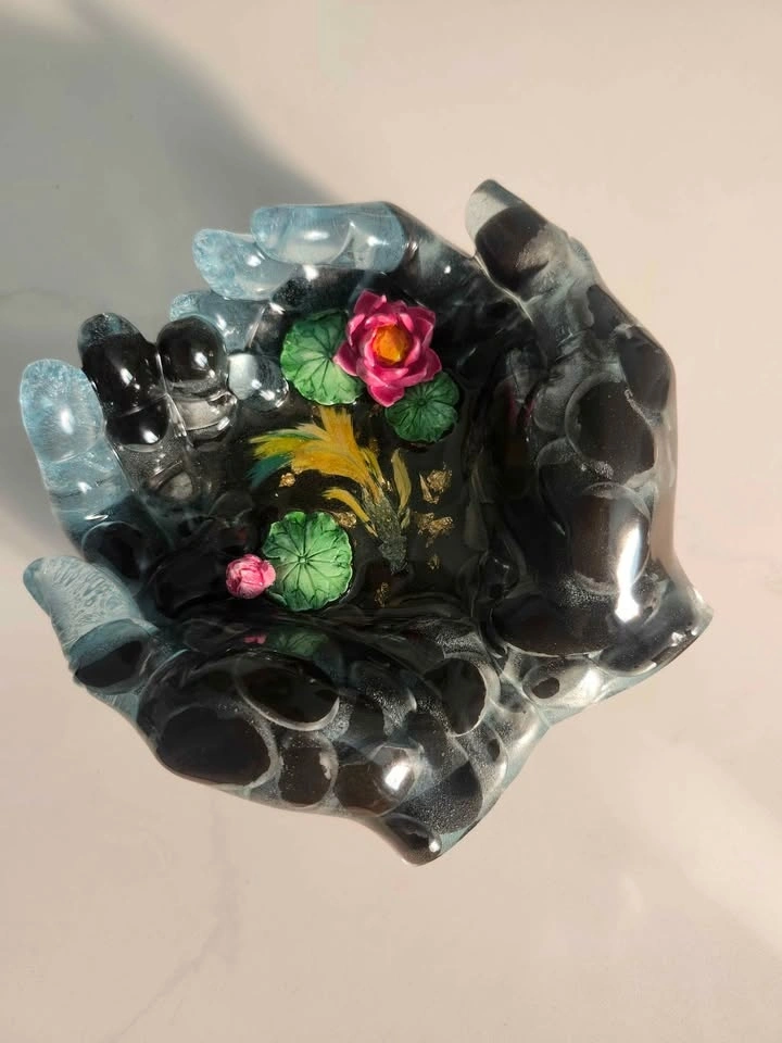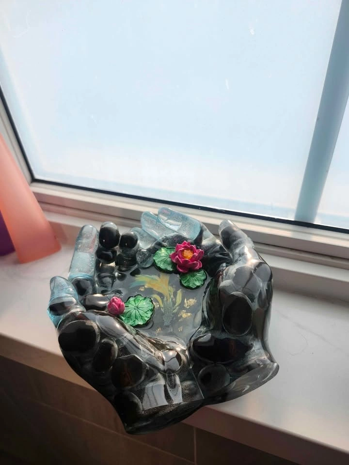 Hand crafted resin hands dish with hand painted beta, lotus flowers and lily pads.