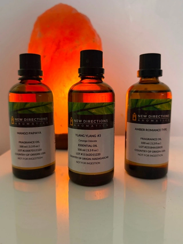 Selling 3 large 100ml essential/fragrance oils from New Directions Aromatics. Includes: Ylang Ylang #3 (Essential Oil), Mango Papaya (Fragrance Oil), Amber Romance Type (Fragrance Oil). Each bottle is 100ml. High-quality oils from New Directions Aromatics. Great for diffusers, candles, soaps, or home fragrance. Brand new and sealed.