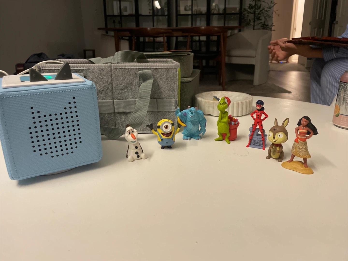 I'm selling a Tonies Toniebox Starter Set in blue! It comes with several figurines, including Olaf, Minion, Sully, The Grinch, Ladybug, a bunny, and Moana
