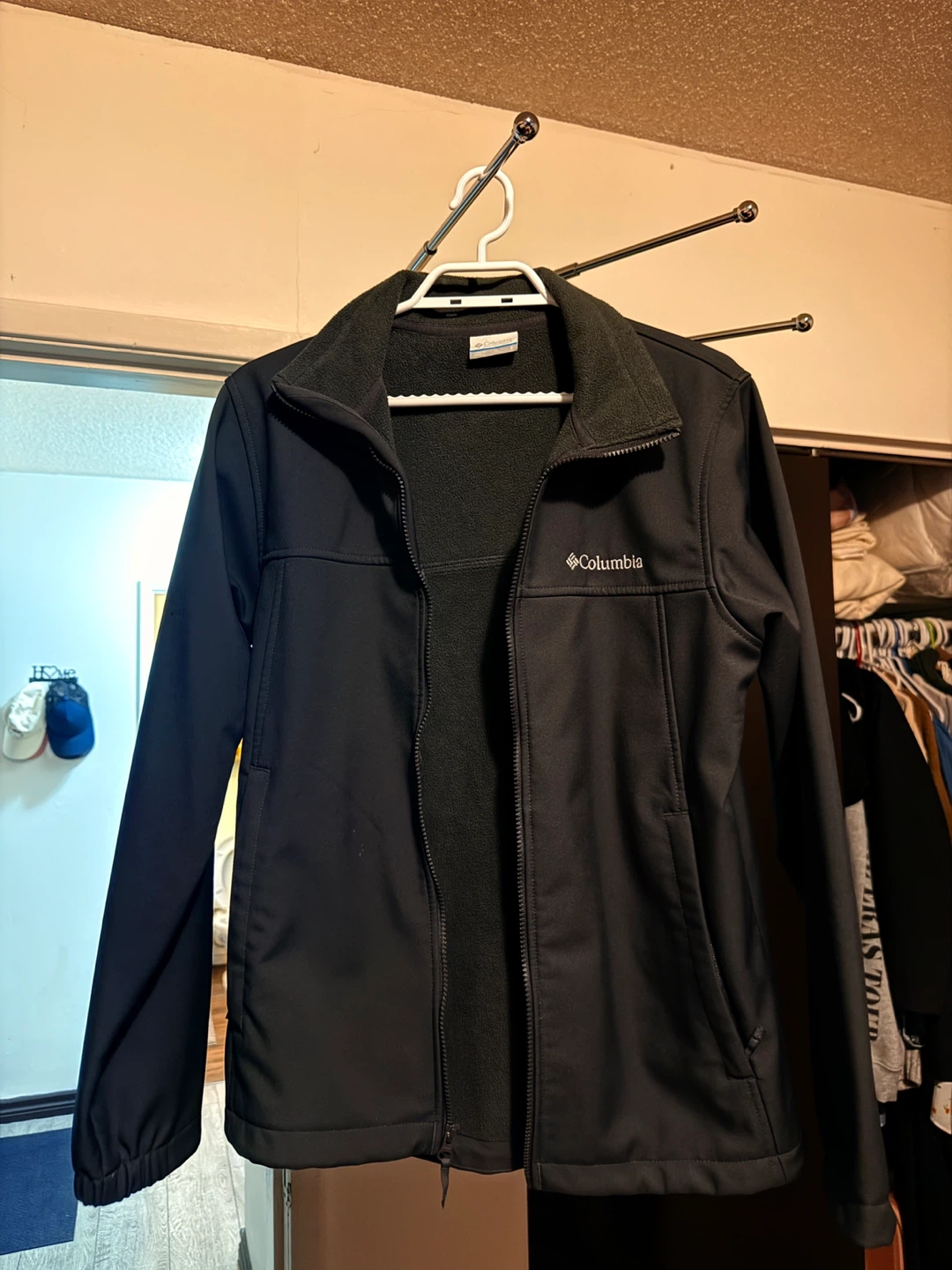 This Columbia jacket is black with a softshell exterior and a cozy fleece lining. It features a full-zip front and two zippered hand pockets. It's great for keeping warm on cooler days.