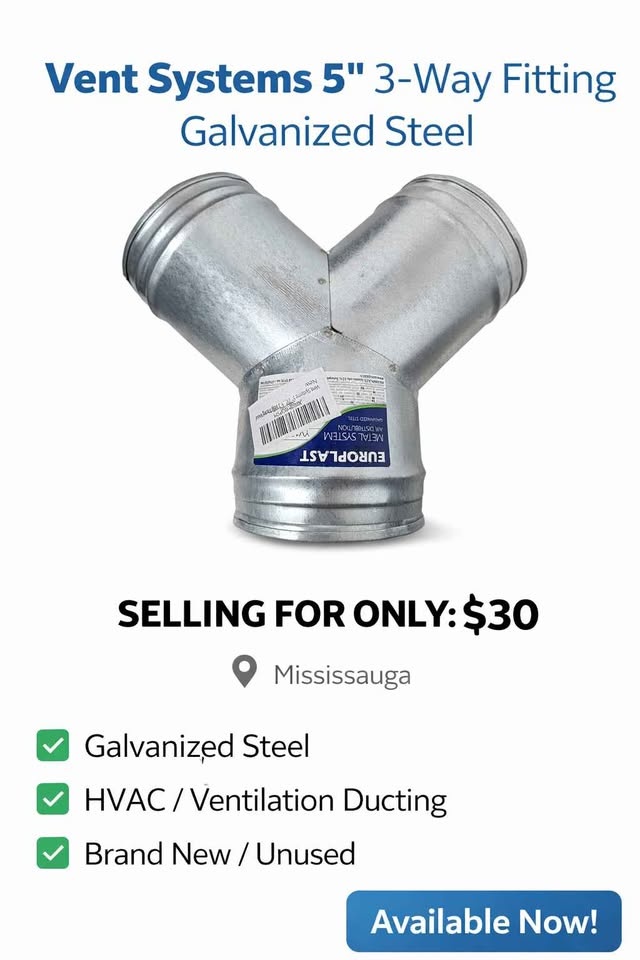 Brand new 5 inch galvanized steel 3-way duct fitting. Heavy duty metal construction. Perfect for HVAC, ventilation, or ducting projects. Never installed. Still has original label. Selling for $30. Pickup in Mississauga near Winston Churchill & Britannia. Cash only.