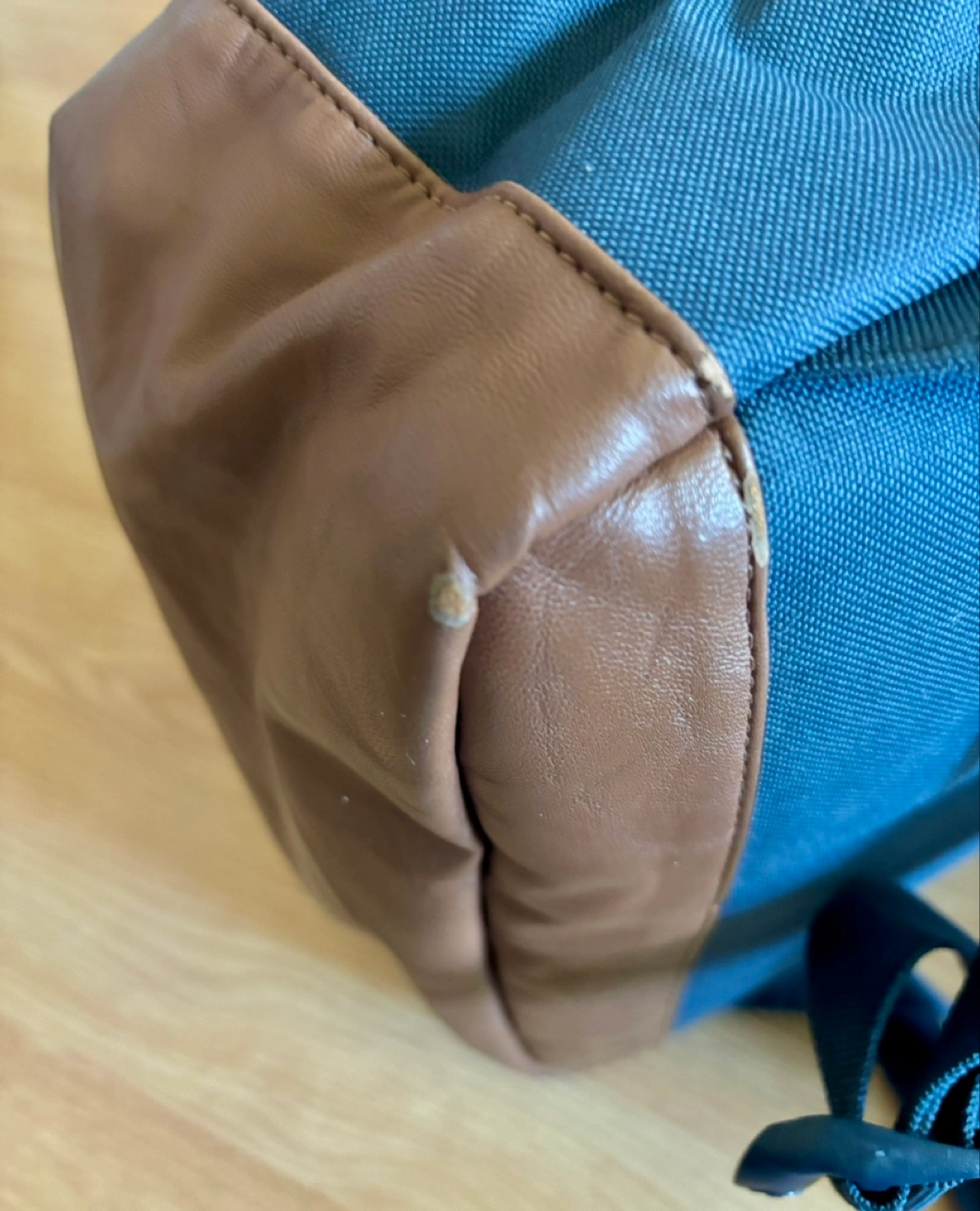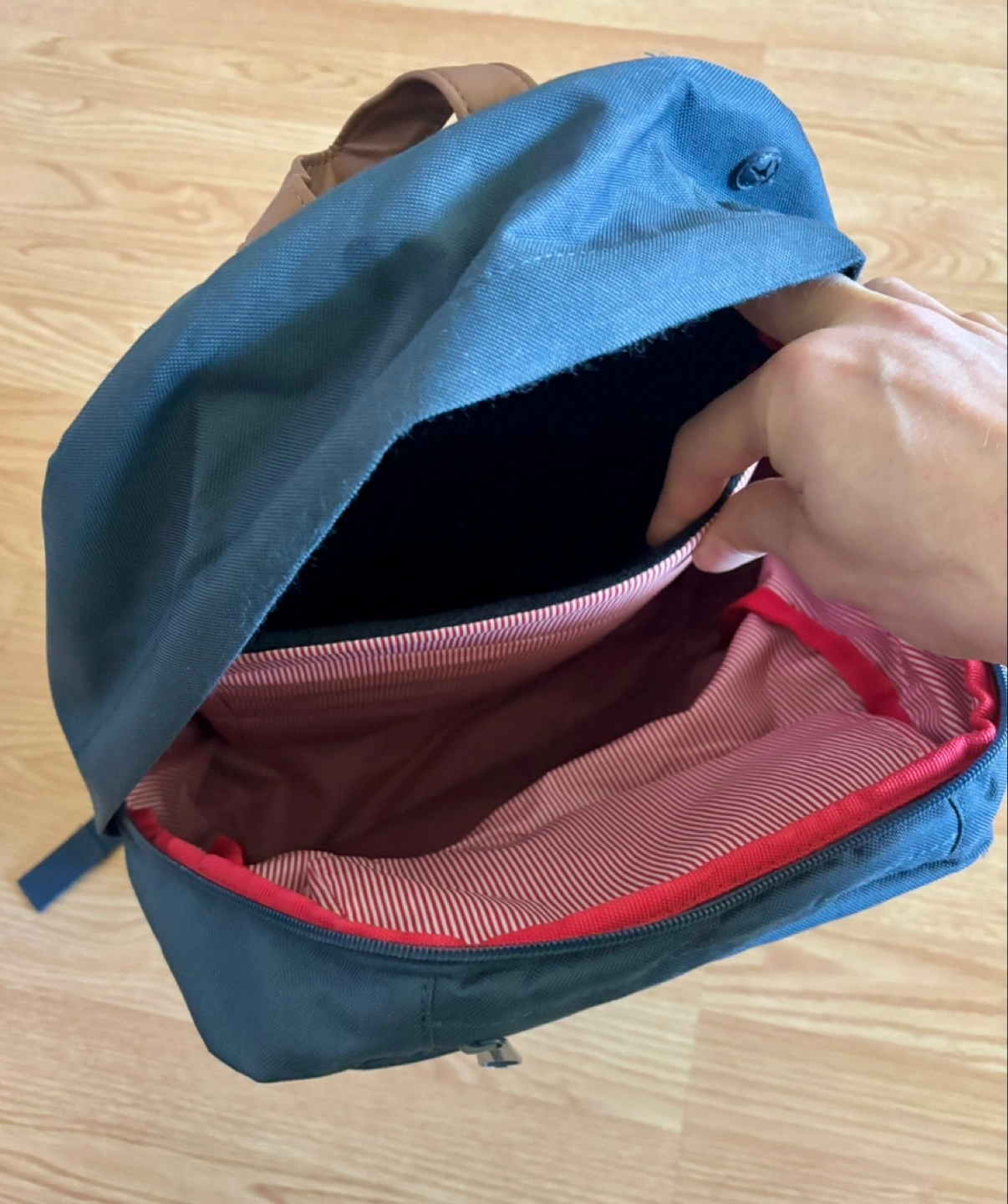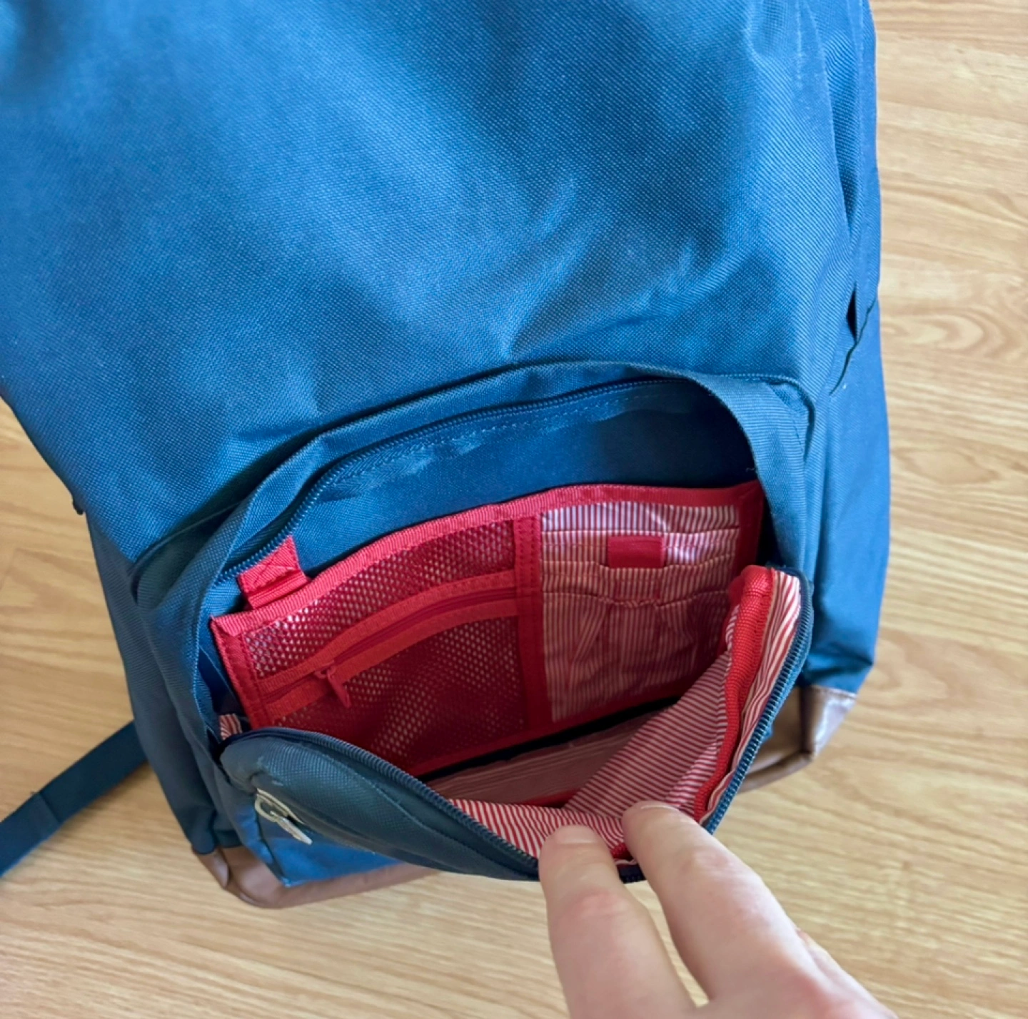 Navy-blue backpack with brown accents. Multiple zippered compartments. Front pocket with a white stripe detail. Internal organization with red striped fabric.