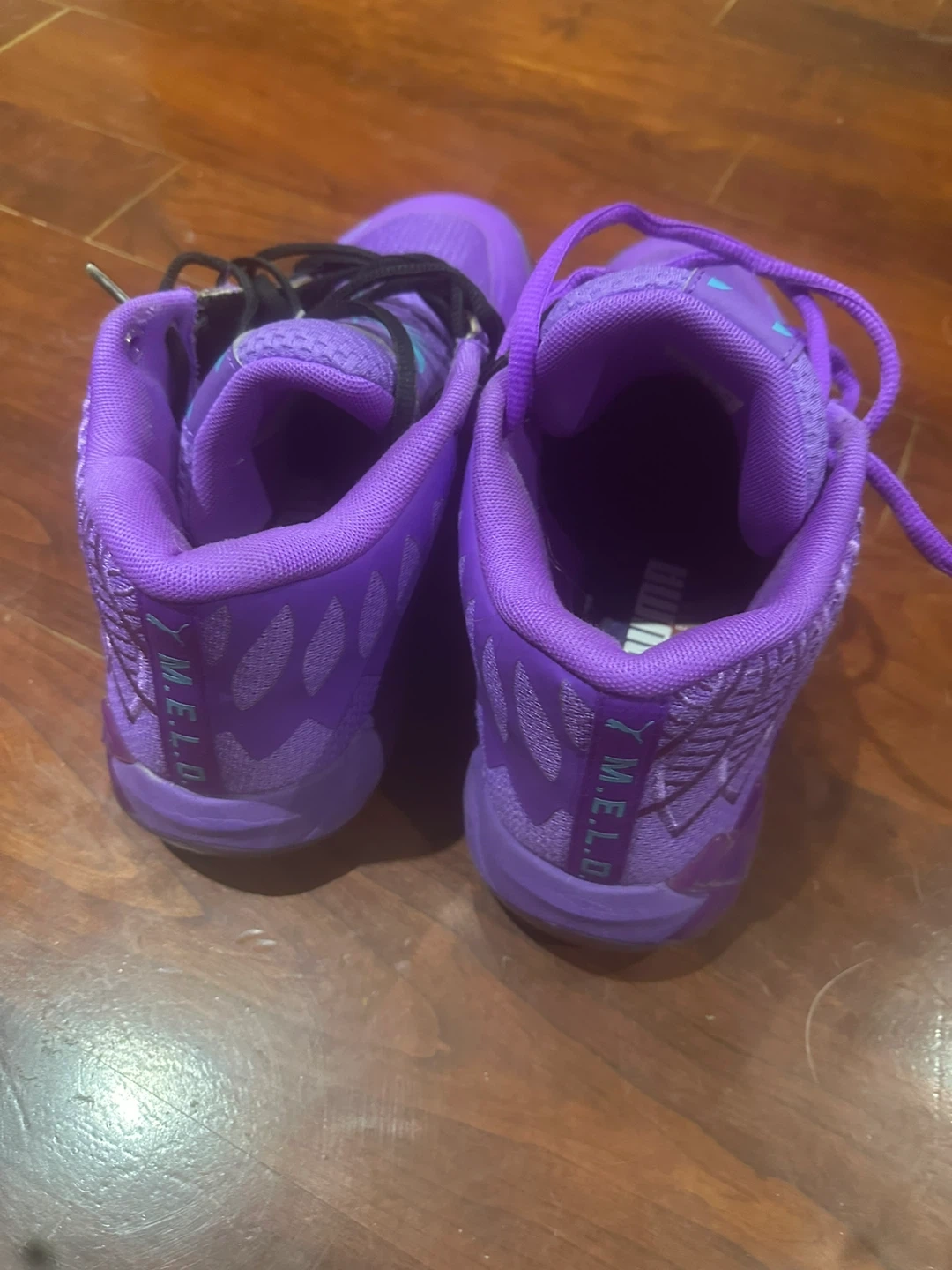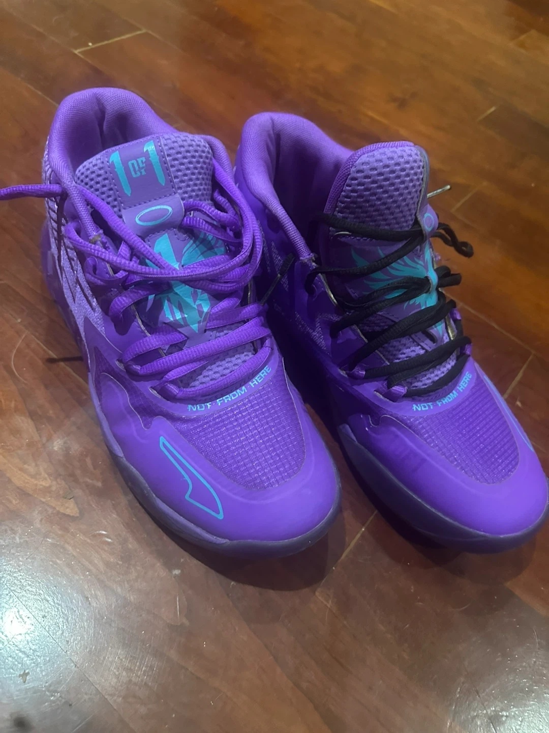 Selling a pair of Puma MB.01 Lo "Not From Here" basketball shoes in a vibrant purple colour! These are a US size 10. They have a unique design and are in great condition, perfect for on the court or just for everyday wear