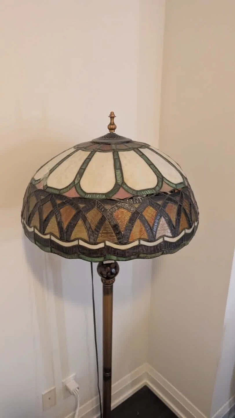 A beautiful Tiffany style stained glass floor lamp with a multicoloured dome shade. It features a dark wood-finish pole and a sturdy round base. This lamp adds a warm and inviting glow to any room.