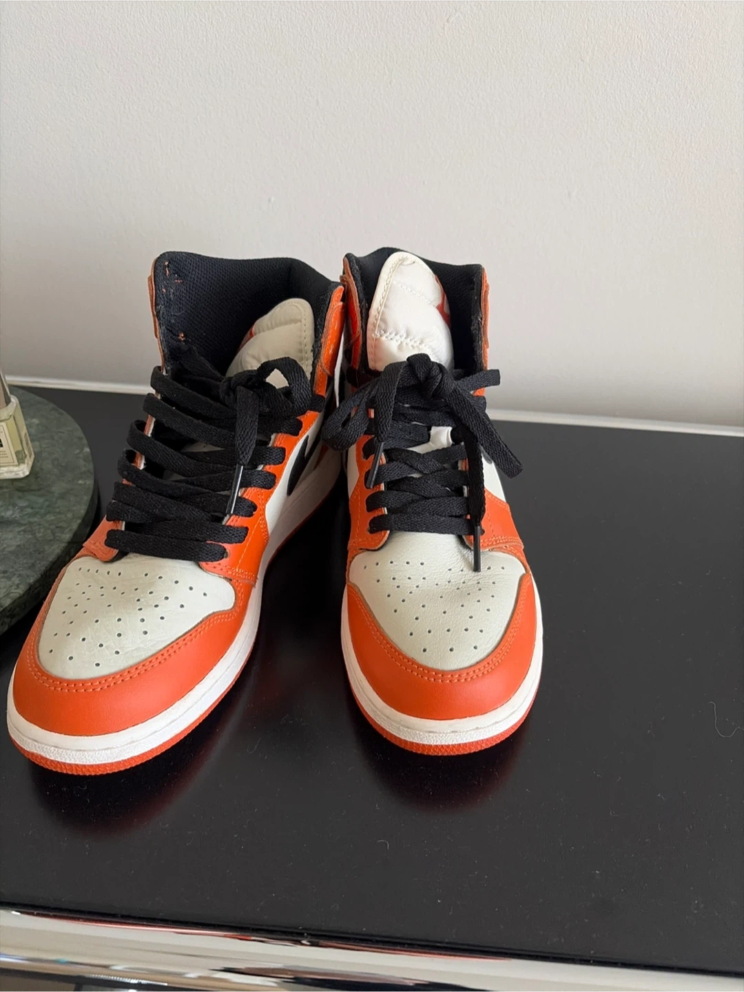 Iconic Air Jordan 1 High OG sneakers in the "Shattered Backboard" colorway. Features a combination of premium leather with orange, white, and black accents. These high-top sneakers include the classic Nike Air cushioning for comfort. A must-have for any sneaker enthusiast's collection!