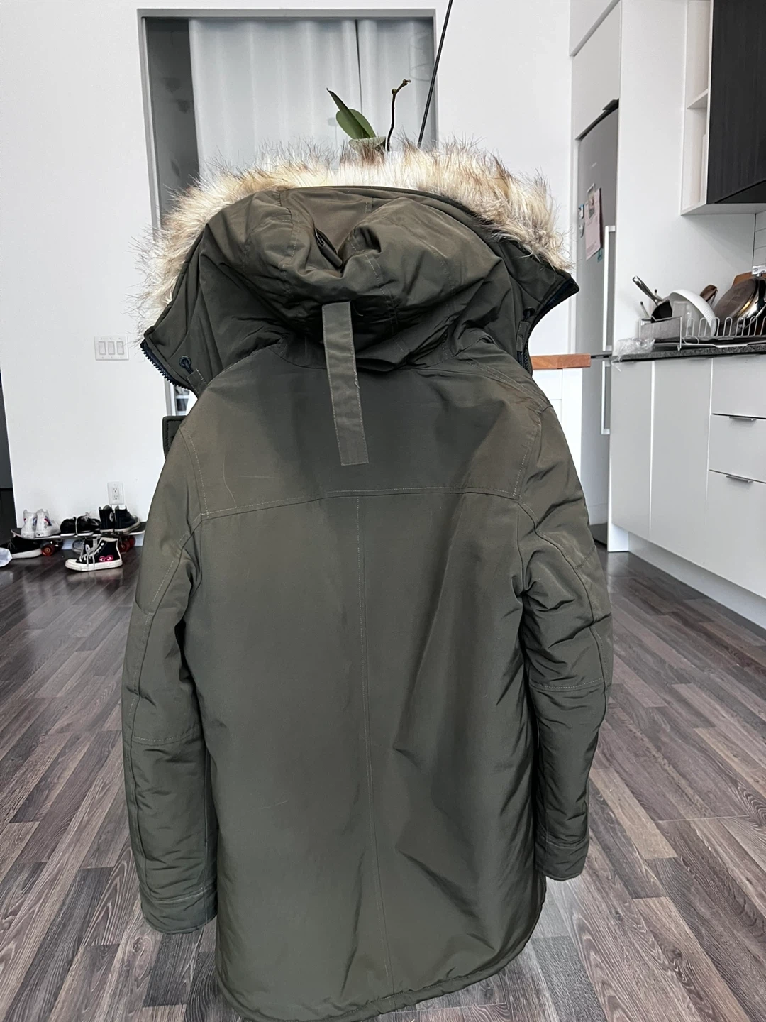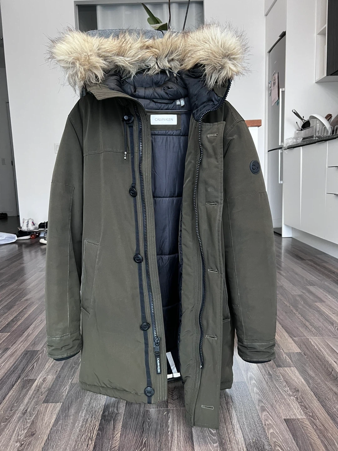 This Calvin Klein parka jacket is a great way to stay warm in the cold. It's a stylish green colour with a comfortable quilted interior. The hood features a removable fur trim. It's a men's size small.