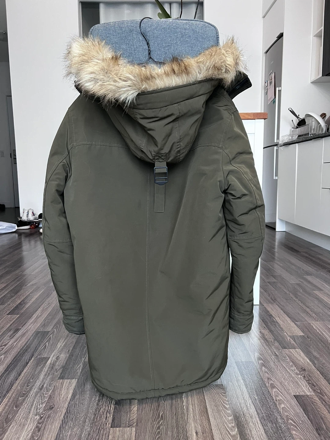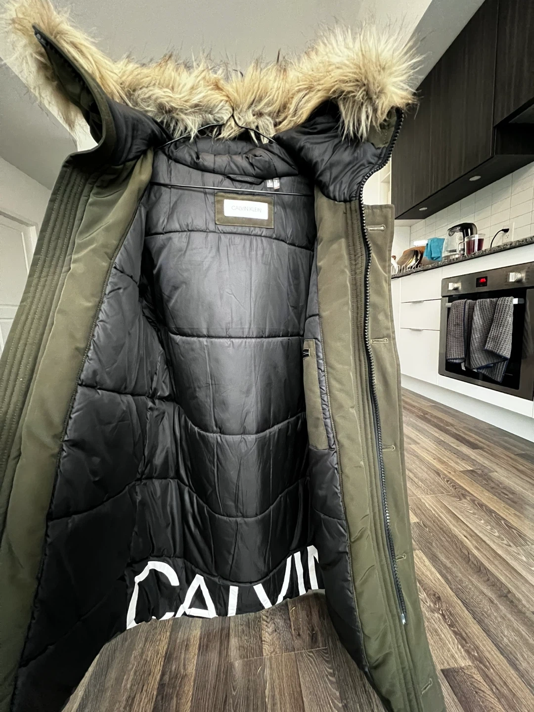This Calvin Klein parka jacket is a great way to stay warm in the cold. It's a stylish green colour with a comfortable quilted interior. The hood features a removable fur trim. It's a men's size small.