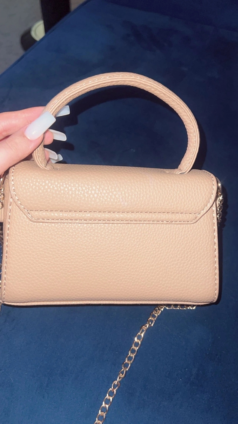 Small beige handbag. Features a gold chain strap and top handle. Heart-shaped accents and a gold clasp. Interior zipper pocket. Perfect for evenings out.