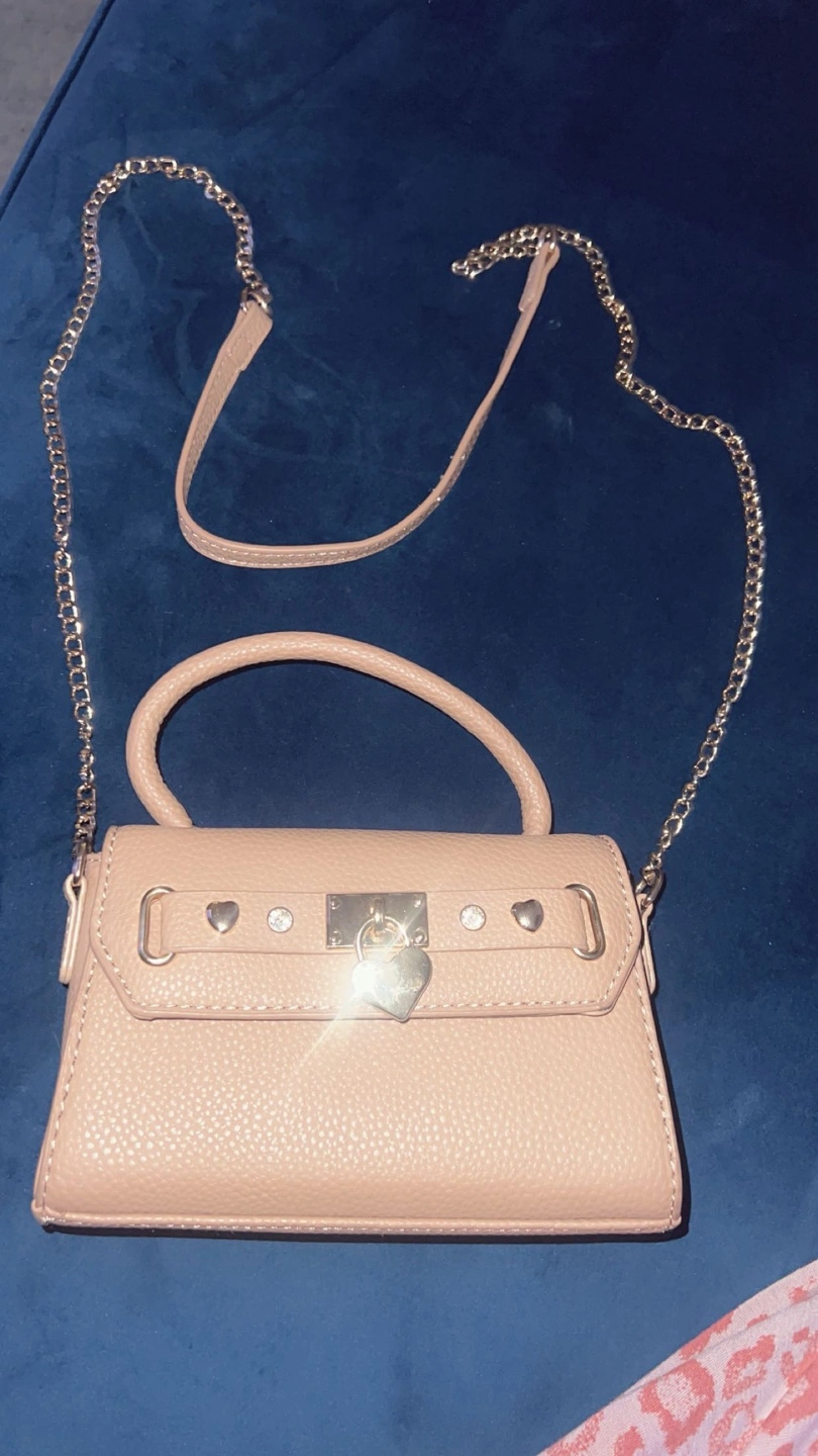 Small beige handbag. Features a gold chain strap and top handle. Heart-shaped accents and a gold clasp. Interior zipper pocket. Perfect for evenings out.