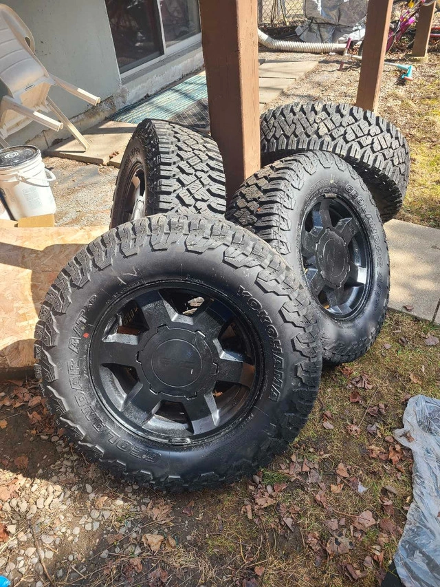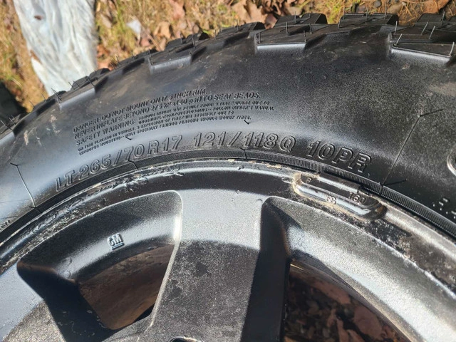 10Tire only 2 months on GMC factory 6 bolt rim. 265 70 17. Tire worth 1700 brand new. 10 ply. Tires and Rims in good shape. No TPMS installed. Should fit Gmc sierra/ Yukon/ chev silverado/ Suburban 1500 1988-2025. Sale for $1500 as a set. Feel free to message if you have any questions!
