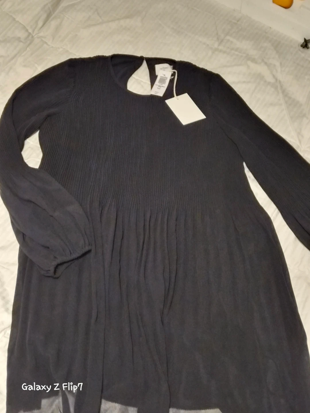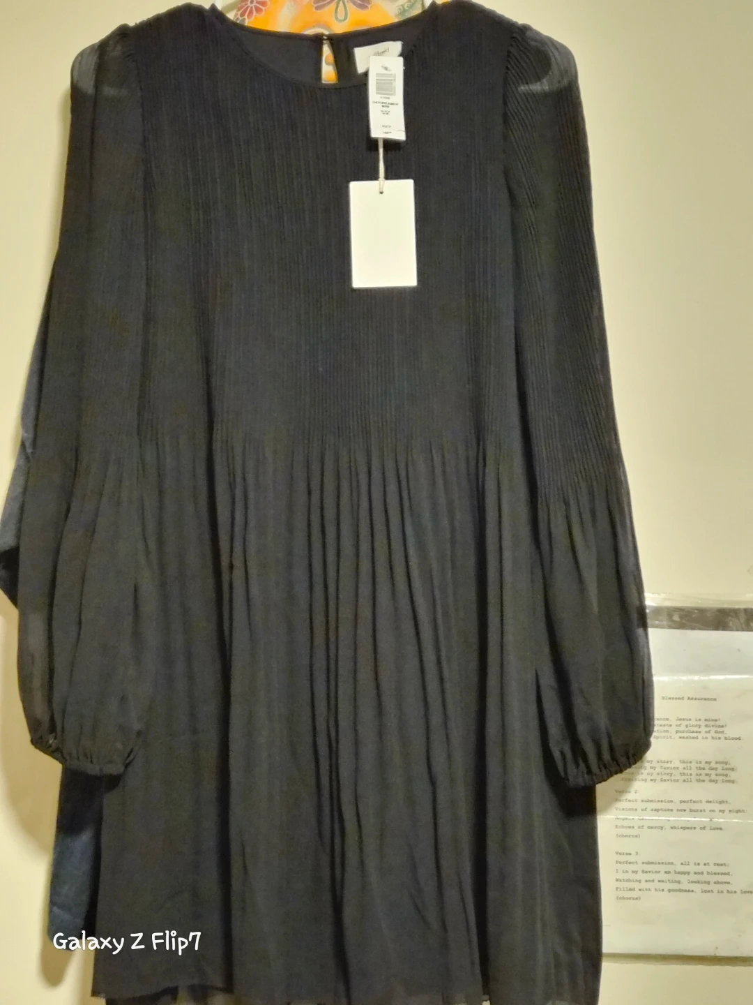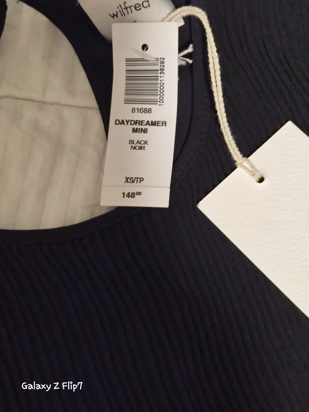 This is a Wilfred Daydreamer Mini dress in black noir. It's size XS/TP. The dress features a pleated bodice and balloon sleeves.
