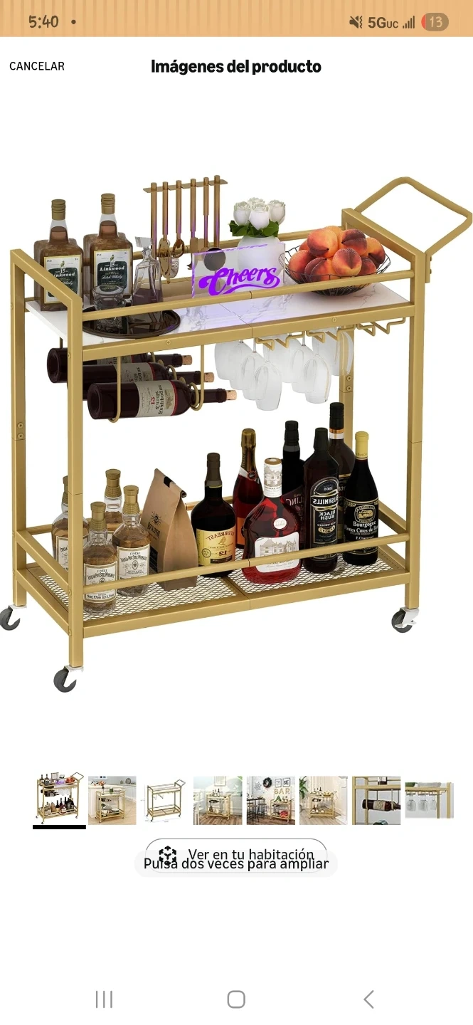 This bar cart features a gold metal frame with a faux marble top. It includes a wine bottle rack and holders for multiple wine glasses. The cart is on wheels for easy mobility. It's perfect for serving drinks and entertaining guests!