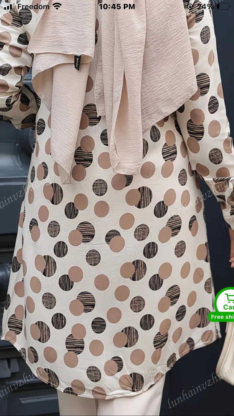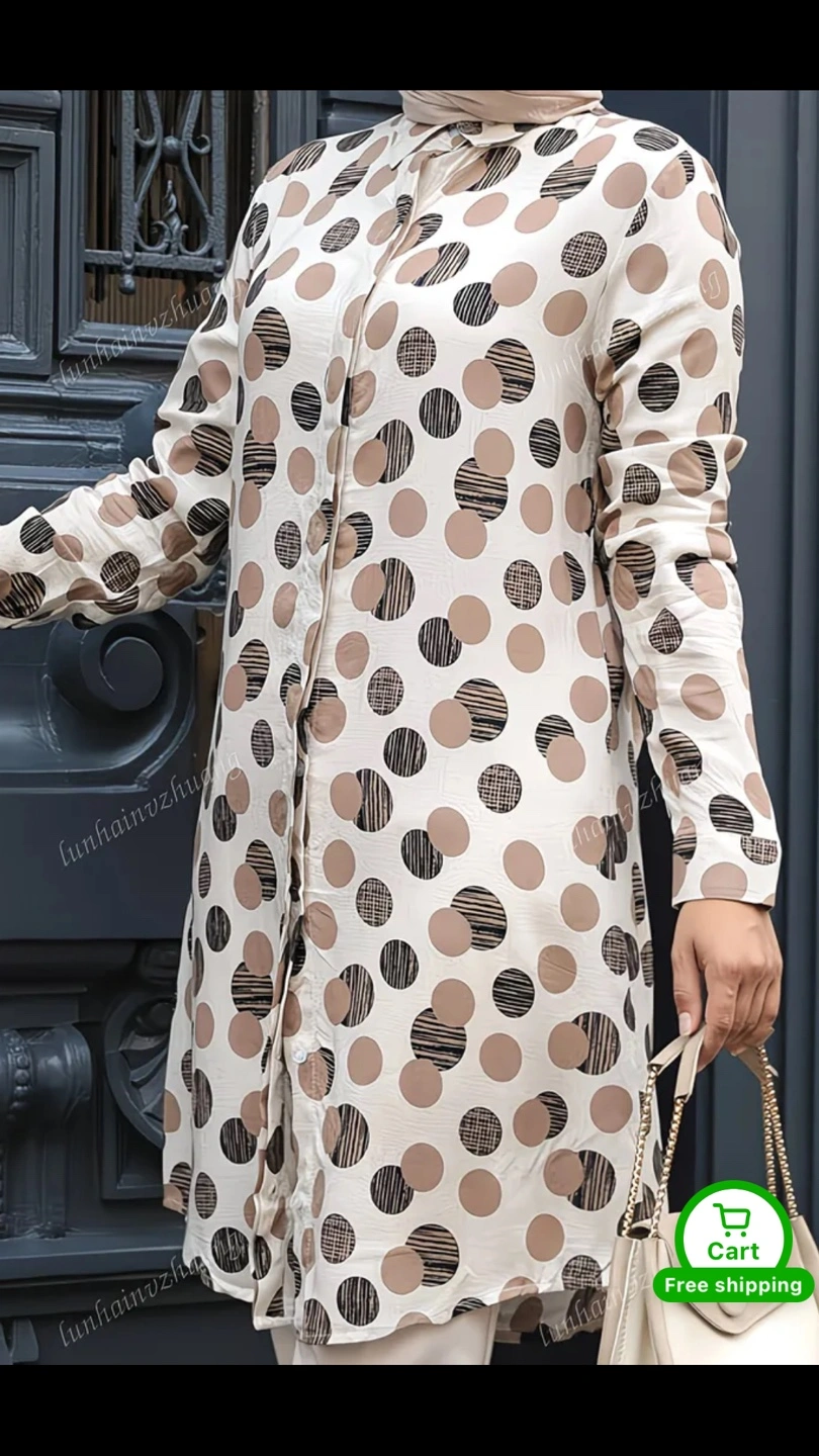 Long sleeve button-up tunic dress with a polka dot pattern. It's a stylish piece featuring a classic collar and button front closure. The fabric is lightweight and breathable, perfect for everyday wear.
