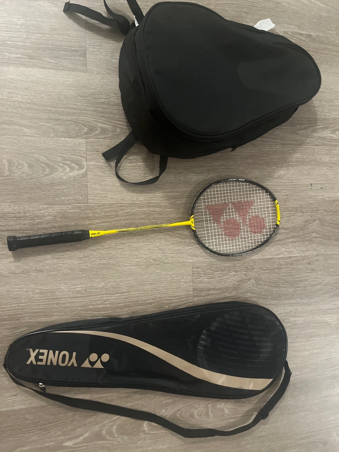 Selling a Yonex badminton racket! It comes with a Yonex racket case and a black backpack. Great for beginners or anyone looking for a reliable racket to play with Yonex Nanoflare 1000 Play yellow 60 Artengo backpack 15 Yonex bat bag 5
