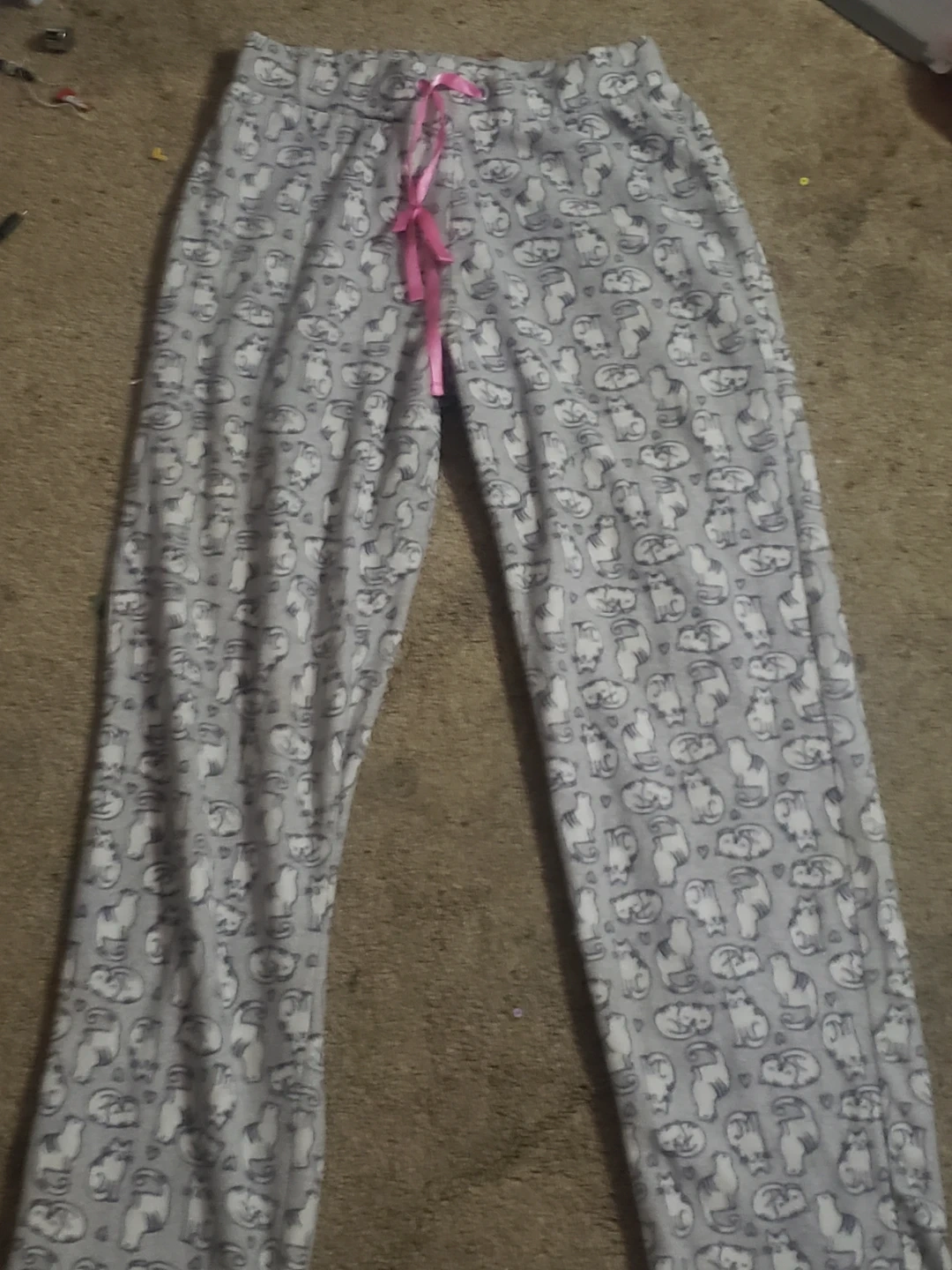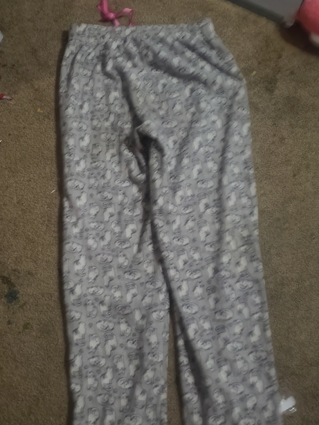 Comfy grey OVS pajama pants with a cute all-over cat print. Features a drawstring waist with a pink ribbon tie. Size S. Soft fleece material for cozy nights!