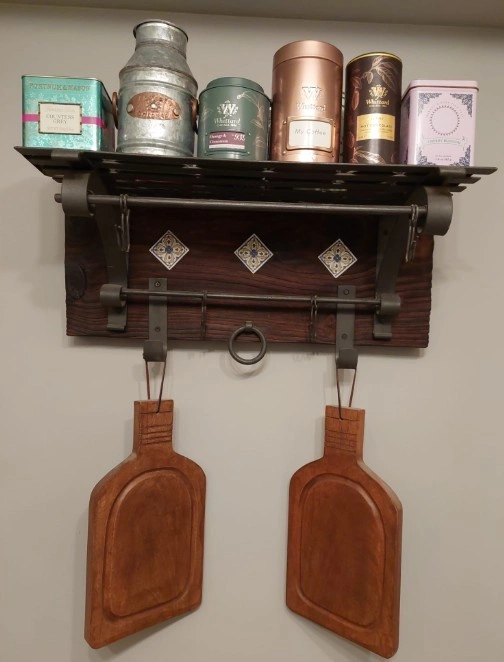 Solid Wood Wall Rack with Metal Hooks + 2 Cutting Boards