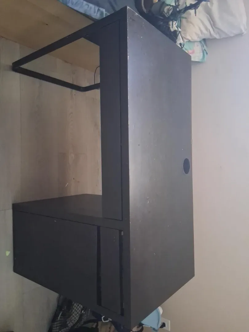 This is a dark brown storage unit with a drawer. It's made of composite material and has a cable management hole. It's a practical piece for organizing your space. Brand new study table trying to sell really quick due to moving