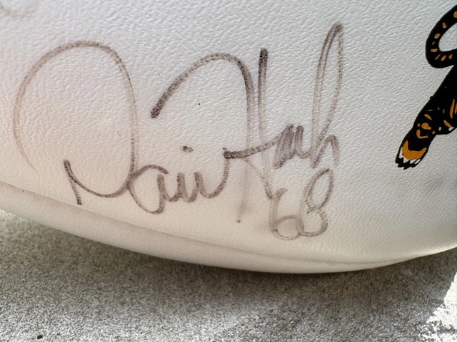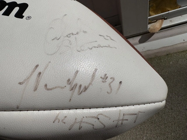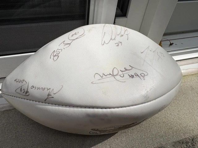 Own a piece of Canadian football history with this 1999 Hamilton Tiger-Cats SIGNED football from their Grey Cup Championship year. This unique collectible features signatures from some members of the team. A few signatures are faded, but it's a great item for any diehard Ticats fan or sports memorabilia collector. Pickup only in Burlington (Pinedale). Price is firm. OSKEE WEE WEE.