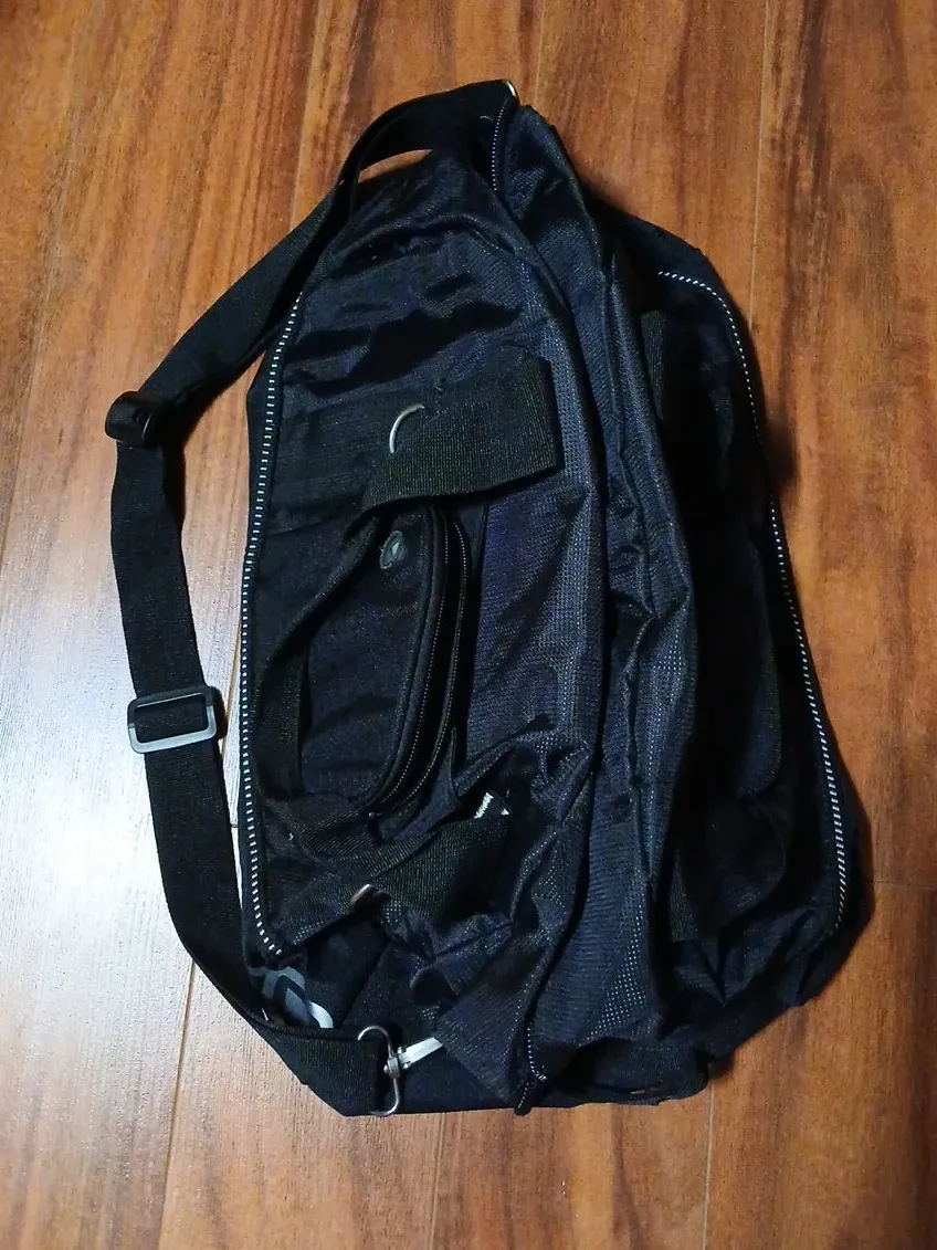 This is a black sling bag, perfect for everyday use. It features multiple zippered pockets for organization. The adjustable strap ensures a comfortable fit.