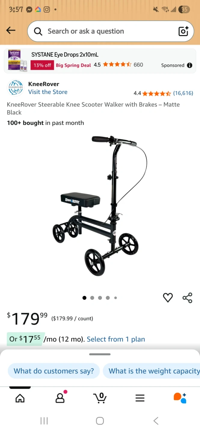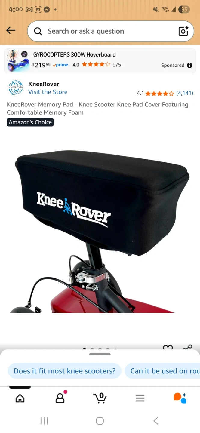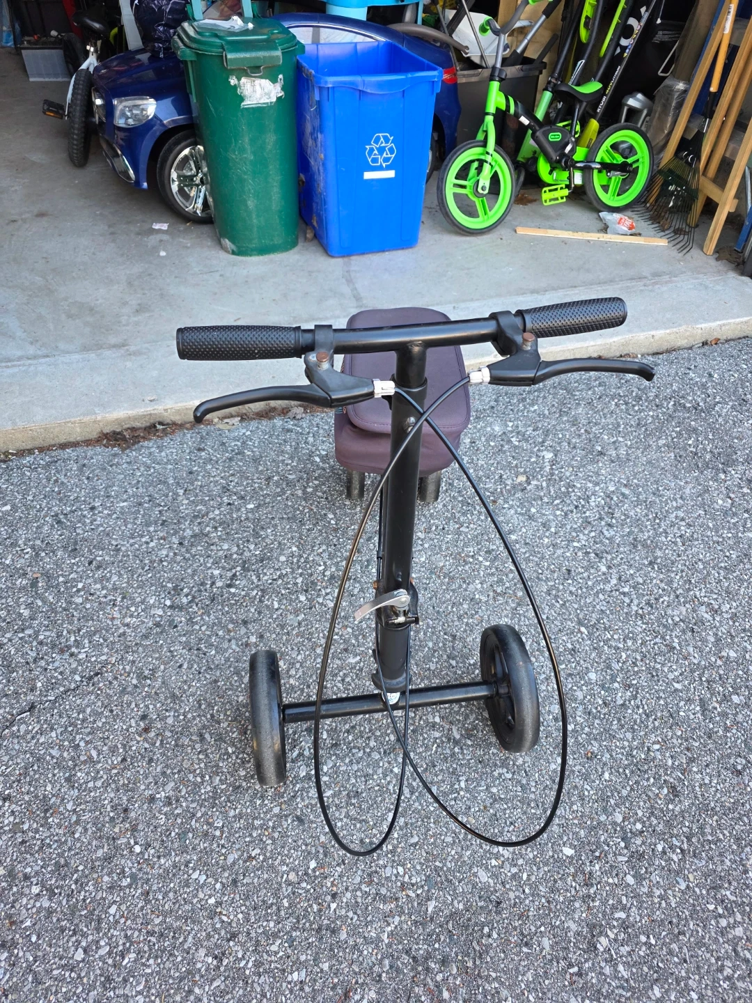 This KneeRover steerable knee scooter walker features brakes for added safety. It offers a comfortable padded seat and adjustable handlebars. Perfect for those recovering from injury or surgery.