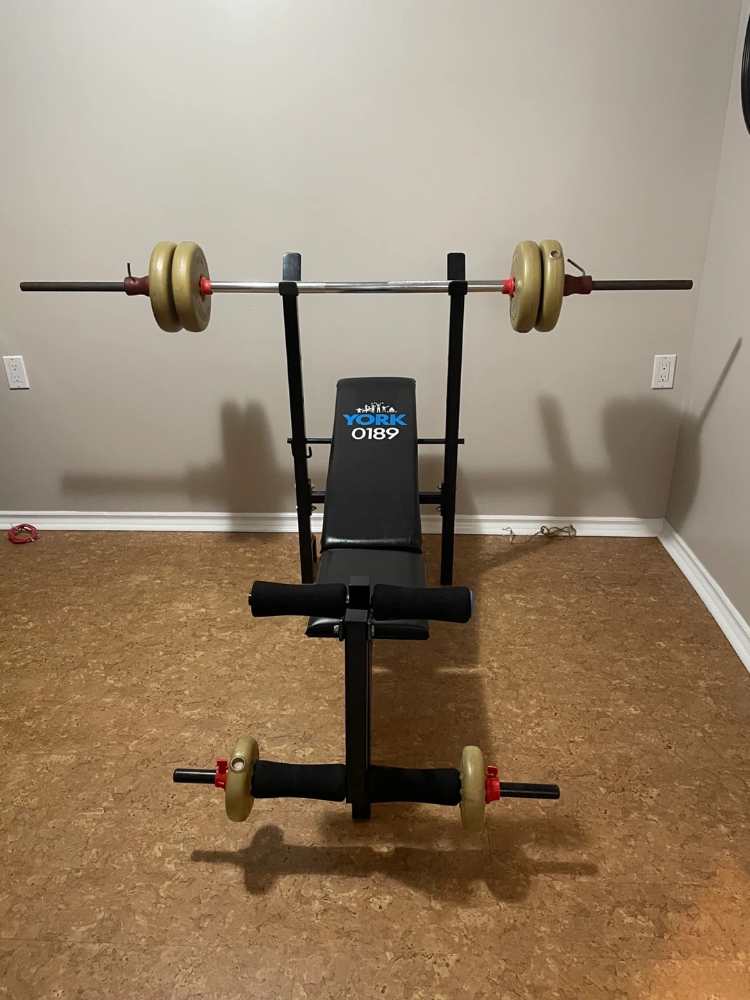 Selling a York 0189 weight bench. It's in good condition and ready for your home gym! Weights and barbell included.