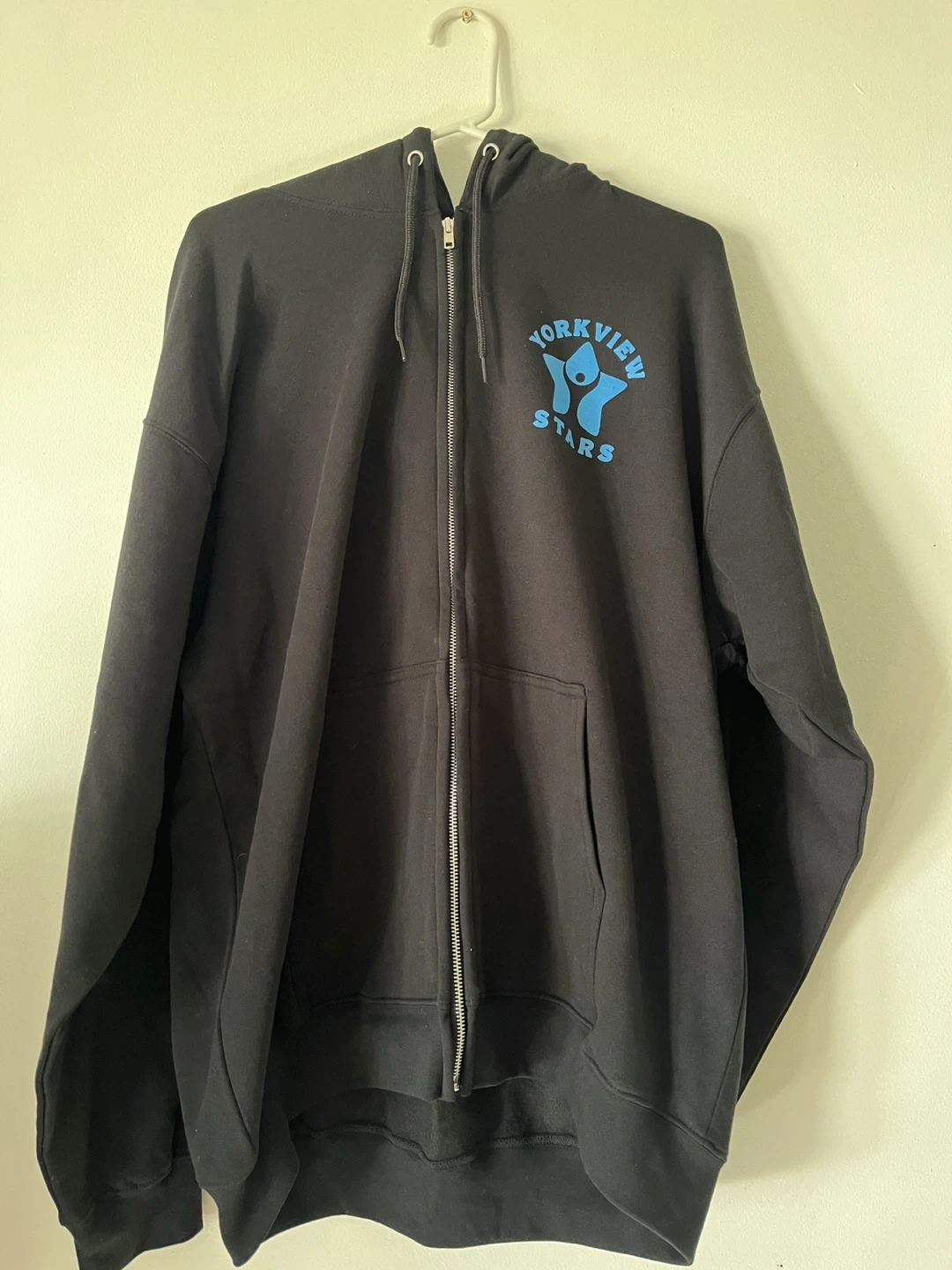 Selling a black zip-up hoodie with the Yorkview Stars logo. It's in great condition and perfect for staying warm. The hoodie features a full zip and a comfortable fit.