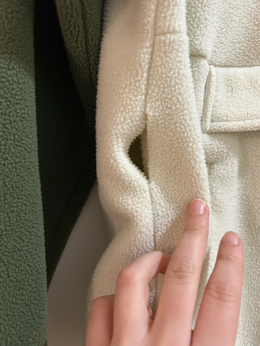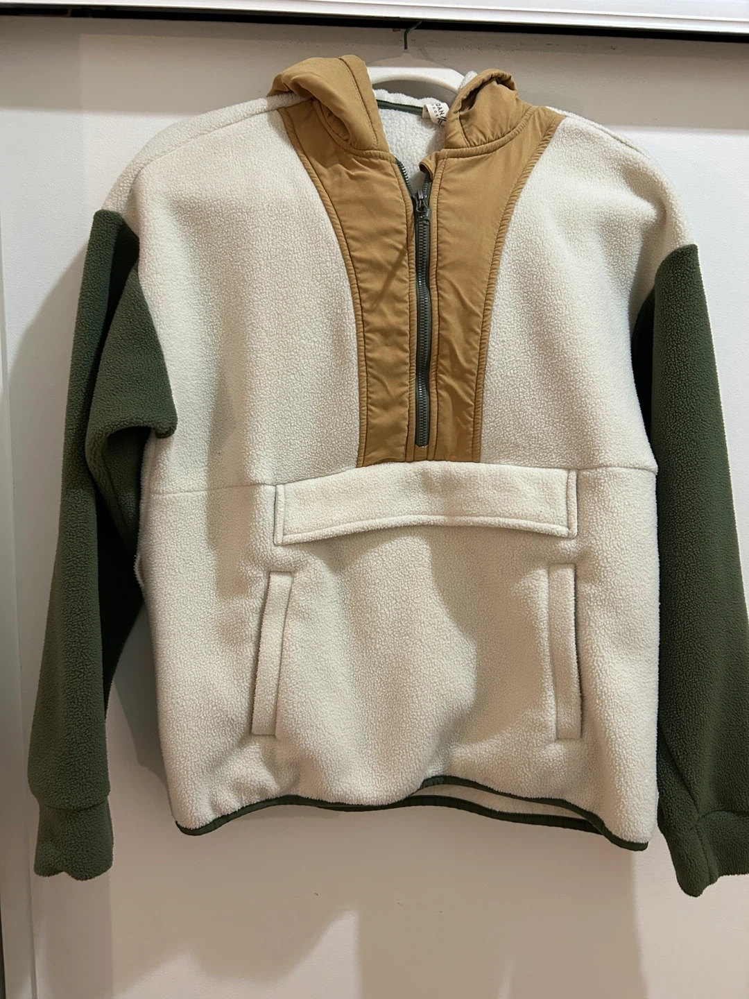Cozy fleece hoodie with a quarter-zip neckline and a large front pocket. It's perfect for staying warm on cooler days. Features a blend of cream, tan, and olive green. Note that there is a small hole.